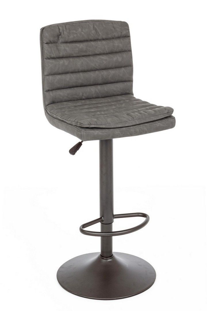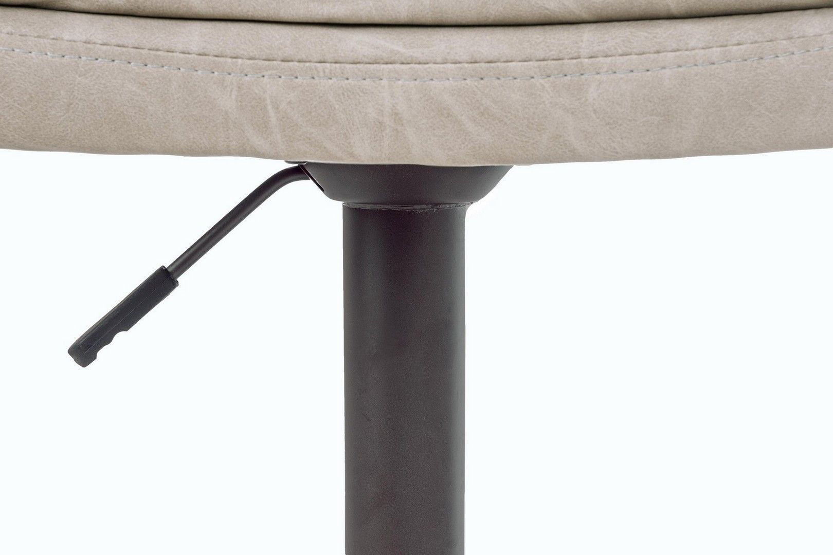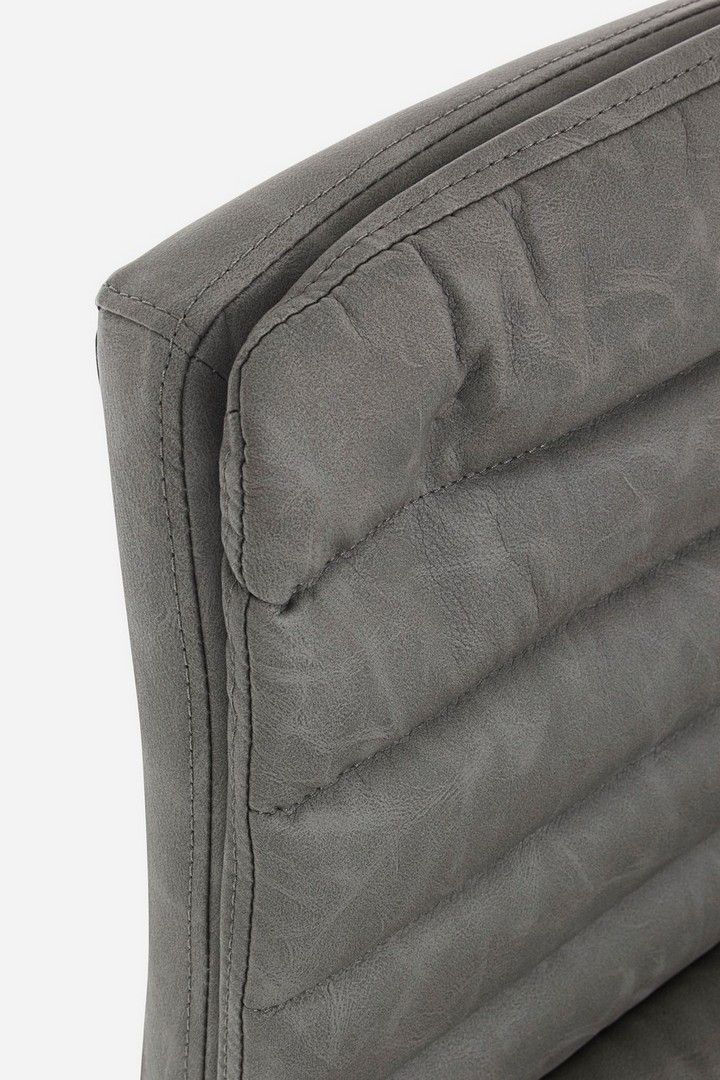 Mebel posiada ramę i podstawę wykonaną ze stali malowanej proszkowo na matowy szary kolor. Siedzisko pokryte jest trwałą imitacją skóry (Imitation Leather), a charakterystyczne, poziome przeszycia podkreślają styl Vintage. Krzesło osadzone jest na stabilnej, okrągłej podstawie o średnicy Ø 41 cm.