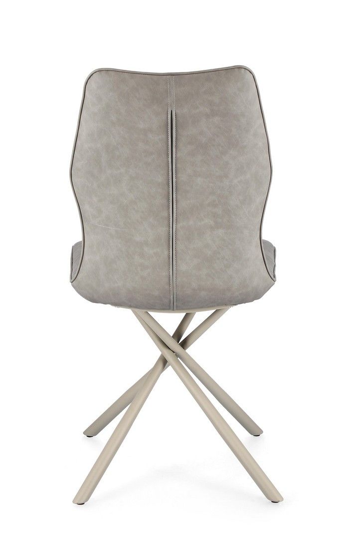 Krzesło charakteryzuje się wysokim oparciem z estetycznymi przeszyciami. Osadzone jest na dynamicznej podstawie ze stali, malowanej proszkową farbą epoksydową, co gwarantuje stabilność. Całość tapicerowana jest wysokiej jakości ekoskórą (Ecospelle).