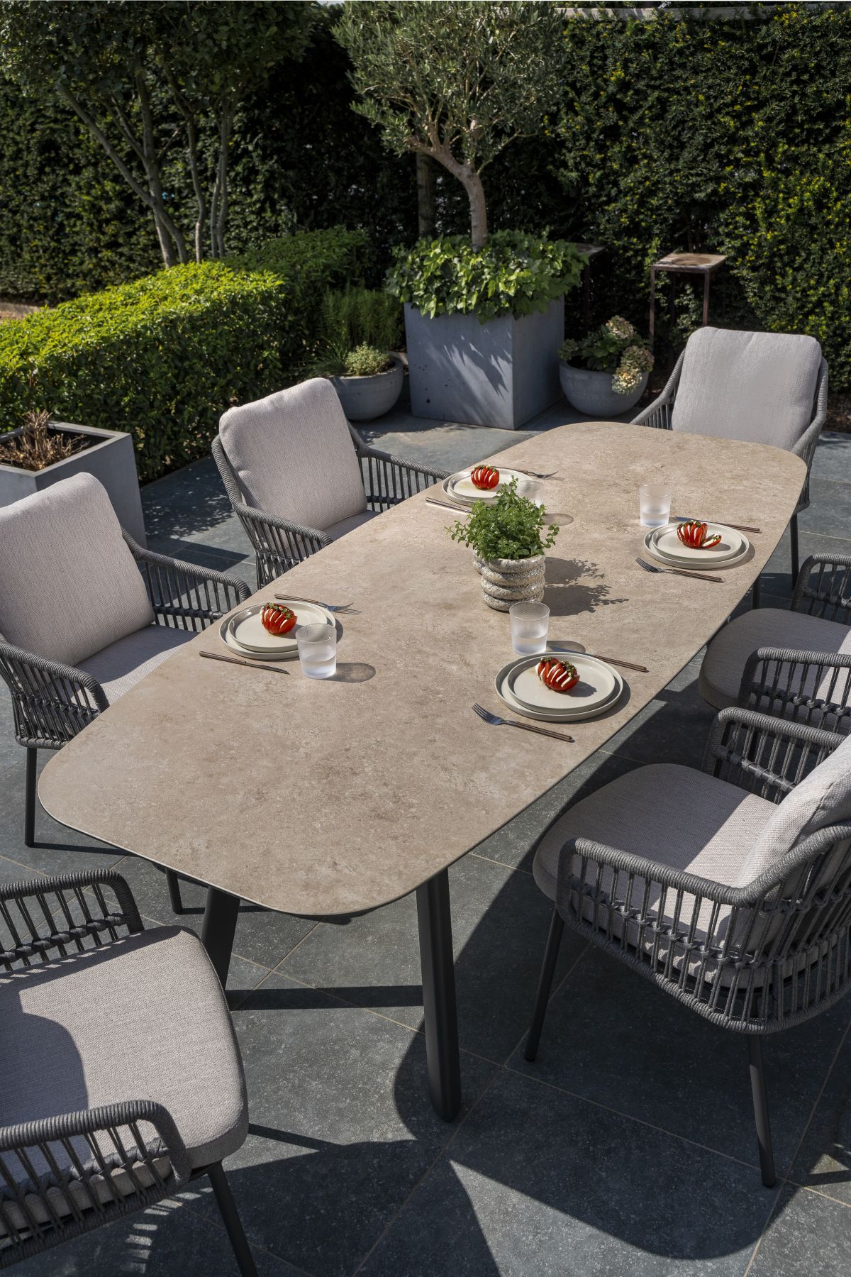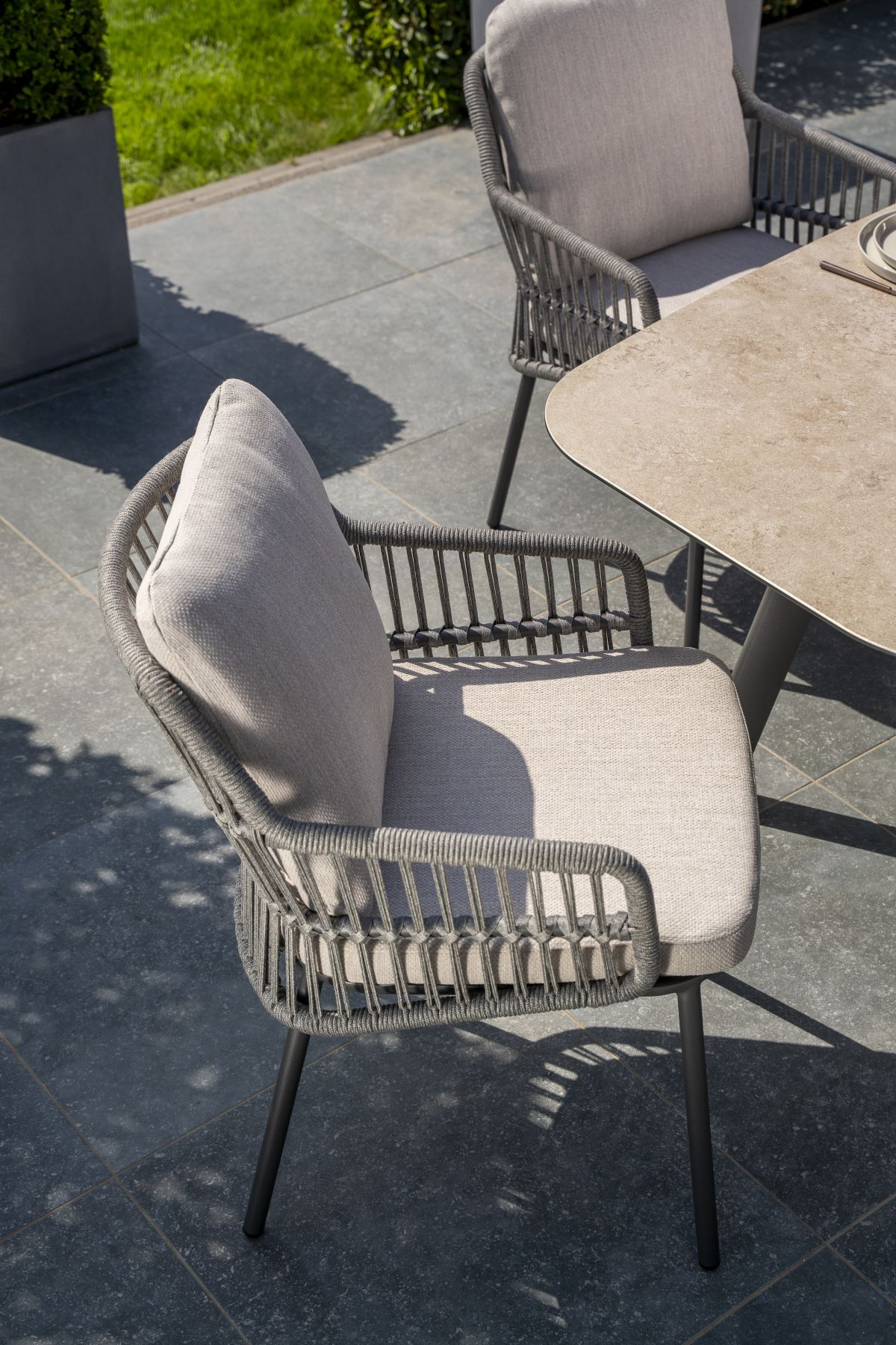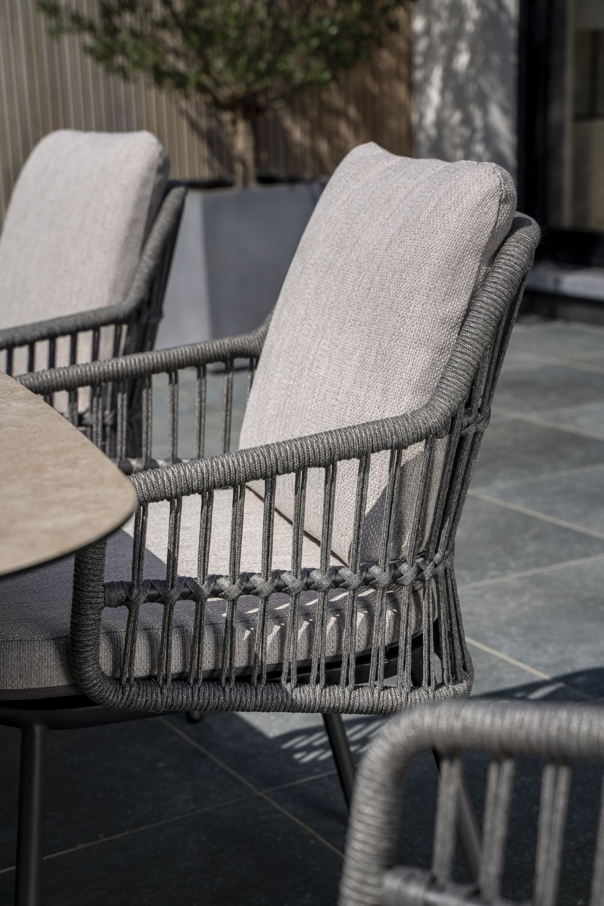 Podstawę mebla stanowi solidna rama wykonana z aluminium / stali malowanej proszkowo w kolorze Antracyt. Konstrukcja oparcia i boków została wykończona splotem sznurowym (Rope) w kolorze Grey (szarym).
