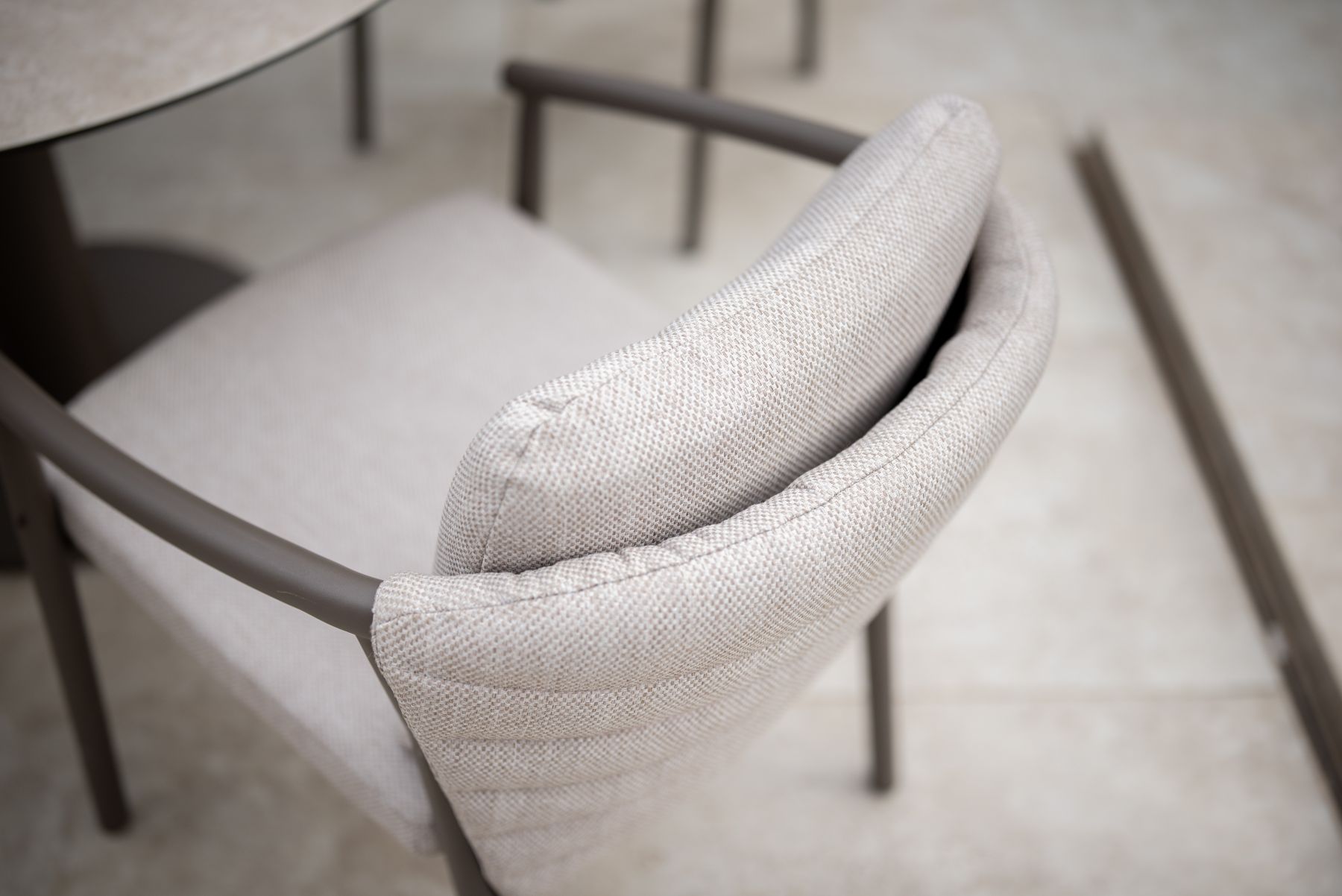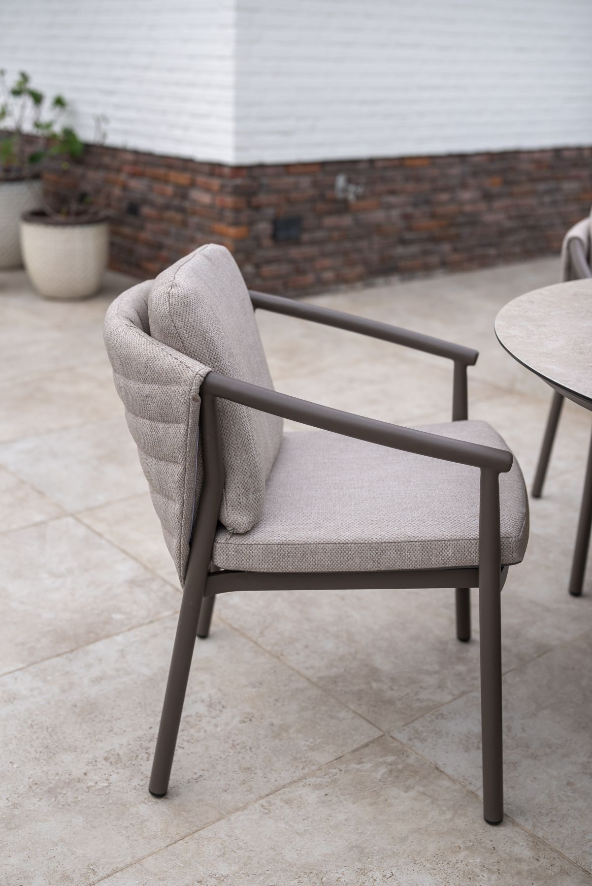 Krzesło Barolo Terre to model o unikalnym charakterze, który wyróżnia się na tle standardowych mebli ogrodowych. Jego znakiem rozpoznawczym jest pikowane oparcie z tkaniny, które zapewnia wyjątkową miękkość i luksusowy wygląd. Całość osadzona jest na solidnej ramie w kolorze Terre, tworząc spójną, nowoczesną kompozycję.