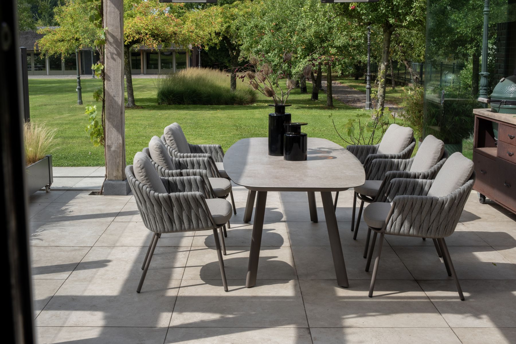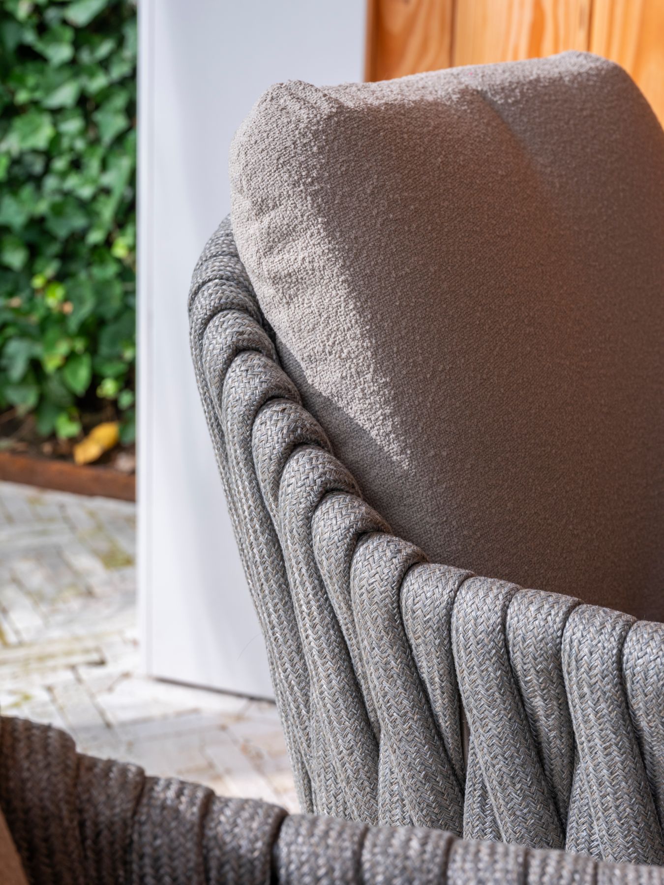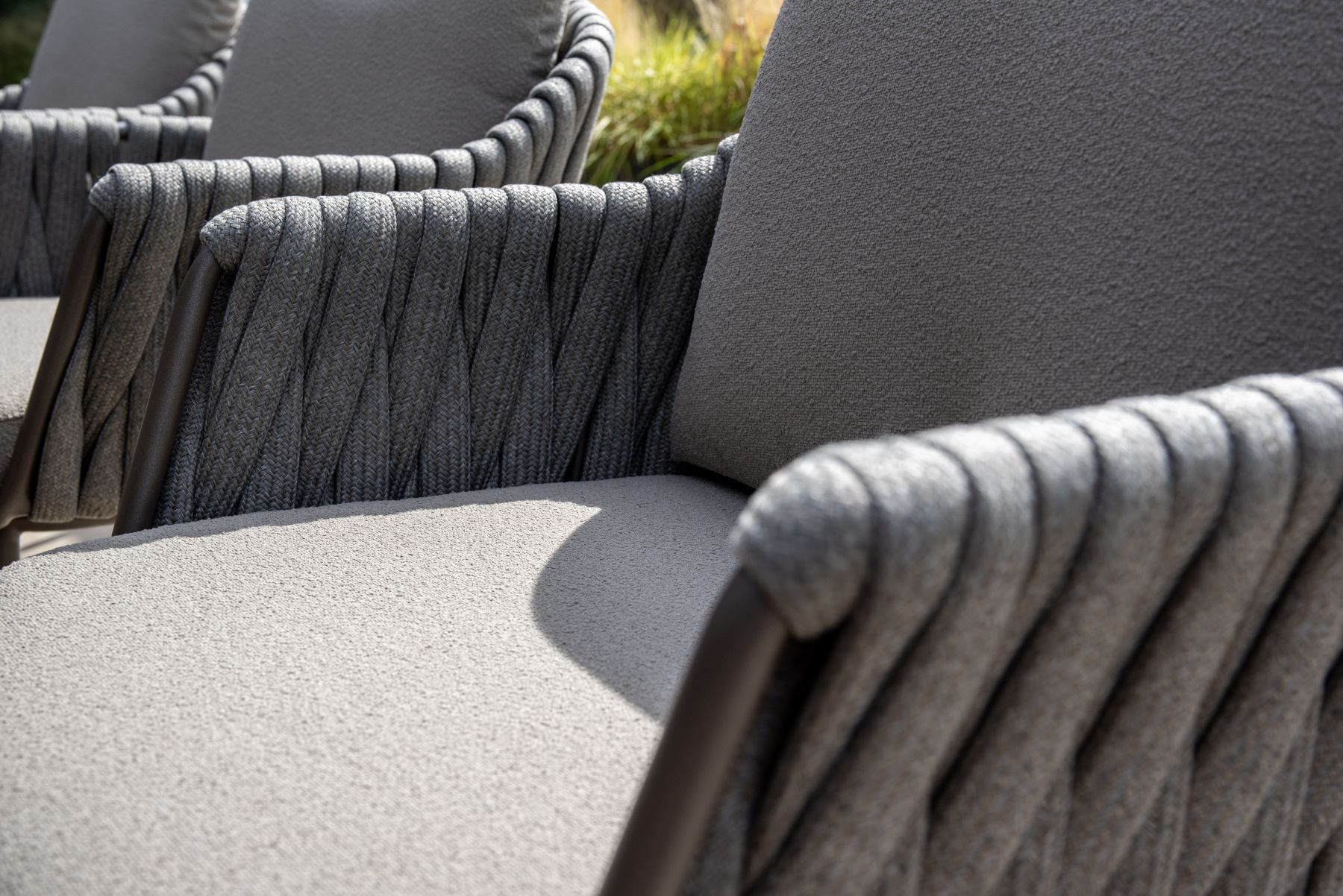 Podstawę mebla stanowi rama wykonana z aluminium / stali malowanej proszkowo w kolorze Terre (głęboki, czekoladowy brąz). Konstrukcję oparcia i boków wypełnia precyzyjny splot sznurowy (Rope) w kolorze szarym (Grey).