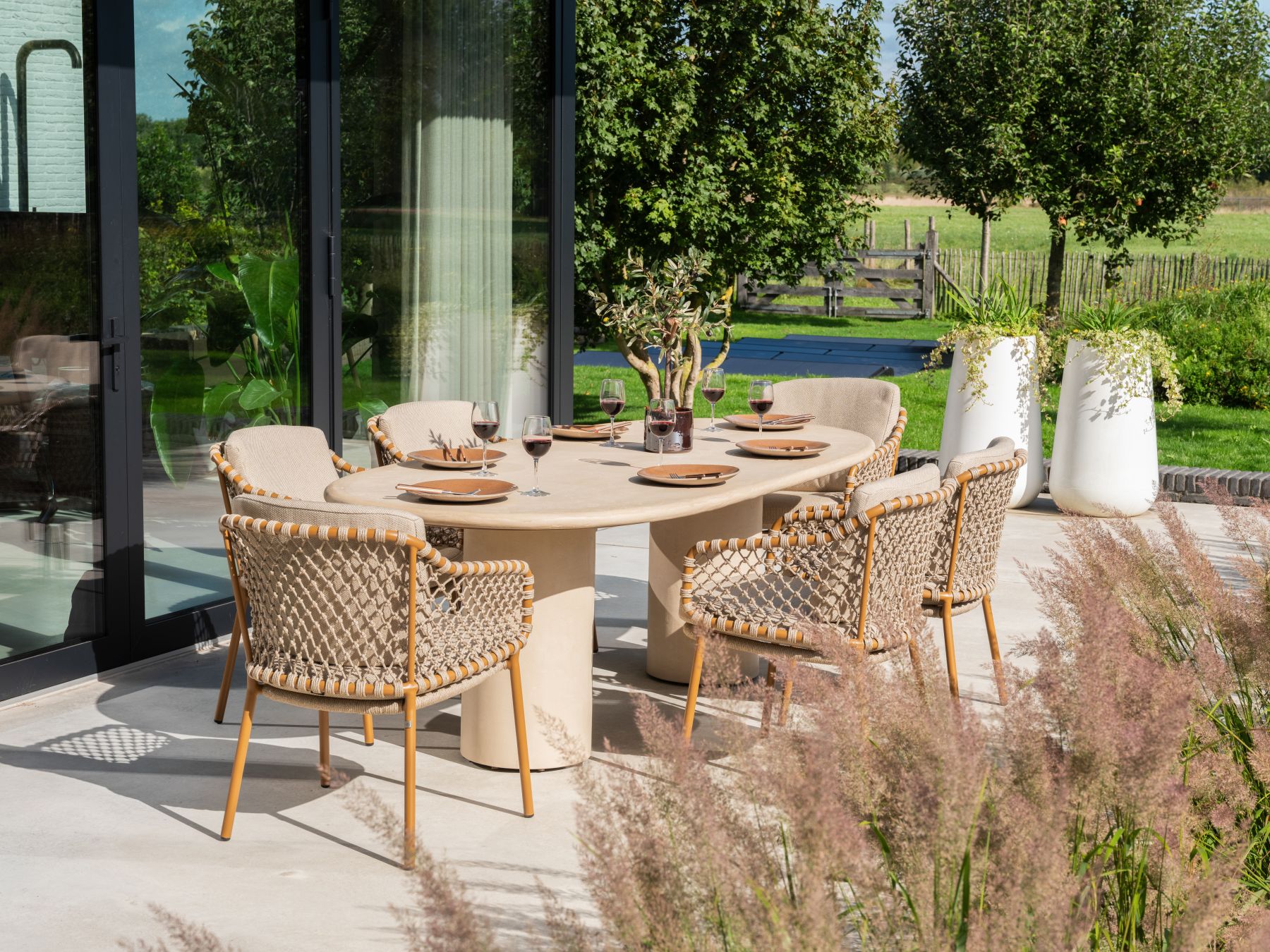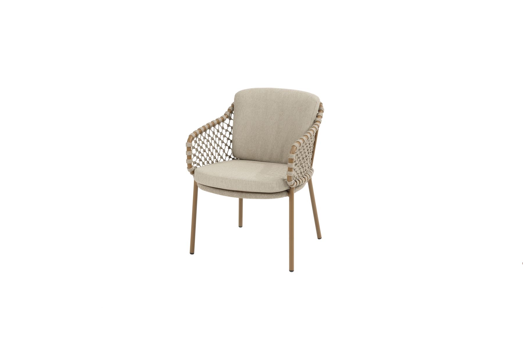 Podstawę stanowi rama z aluminium malowanego proszkowo w kolorze Amber (bursztynowym). Konstrukcja oparcia wypełniona jest eleganckim, plecionym splotem sznurowym (Rope) w kolorze Sand, który nadaje krzesłu lekkości i przewiewności.