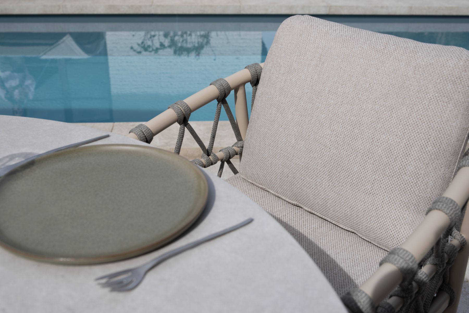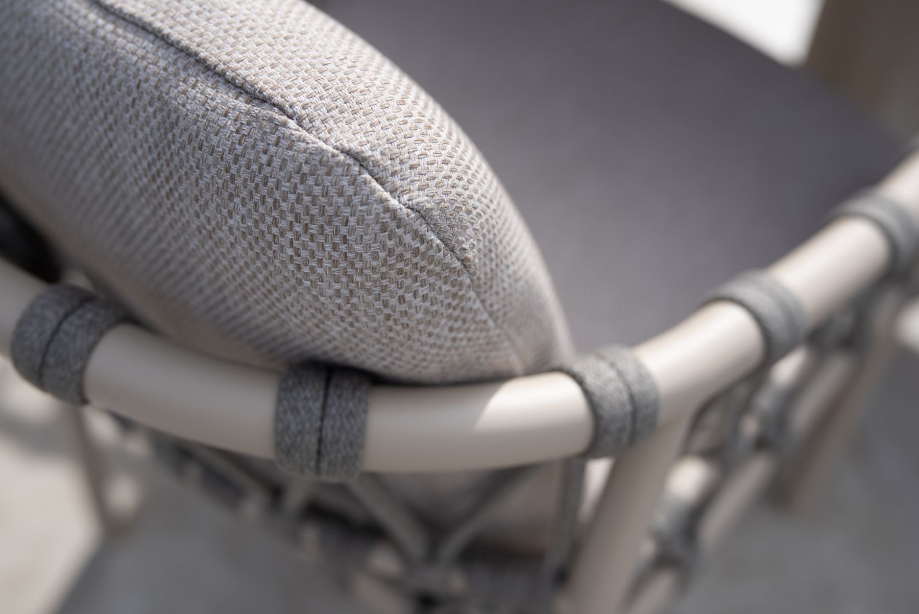 Podstawę mebla stanowi rama wykonana z aluminium / stali malowanej proszkowo w kolorze Latte. Konstrukcję oparcia i boków wypełnia splot sznurowy (Rope) w kolorze szarym (Grey).