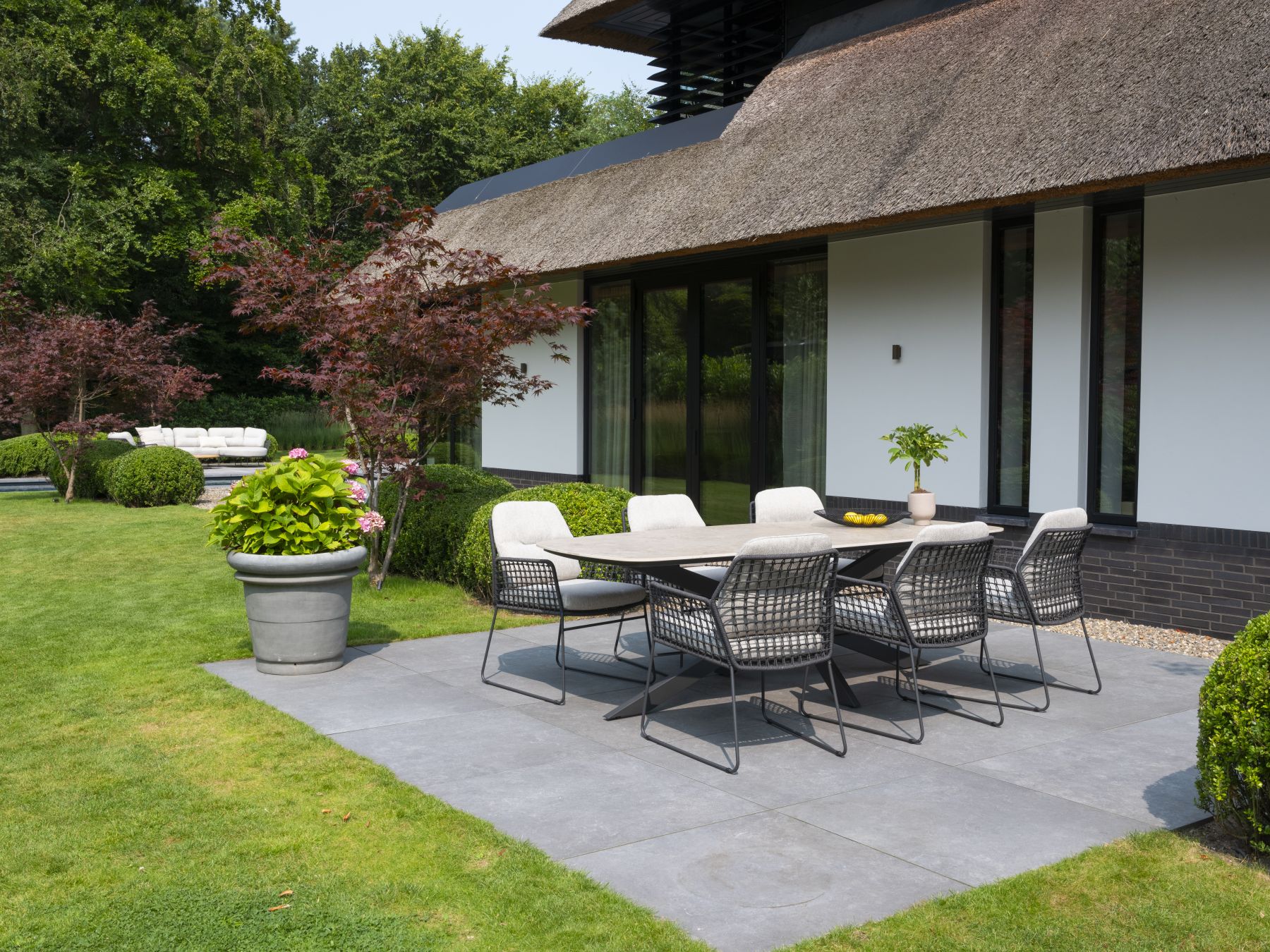 - Poduszki do użytku na zewnątrz: Kolekcja Rhodos jest wyposażona z tkaniny Olefin w kolorze jasnoszarym, które zapewniają wygodę i odporność na deszcz i słońce.
