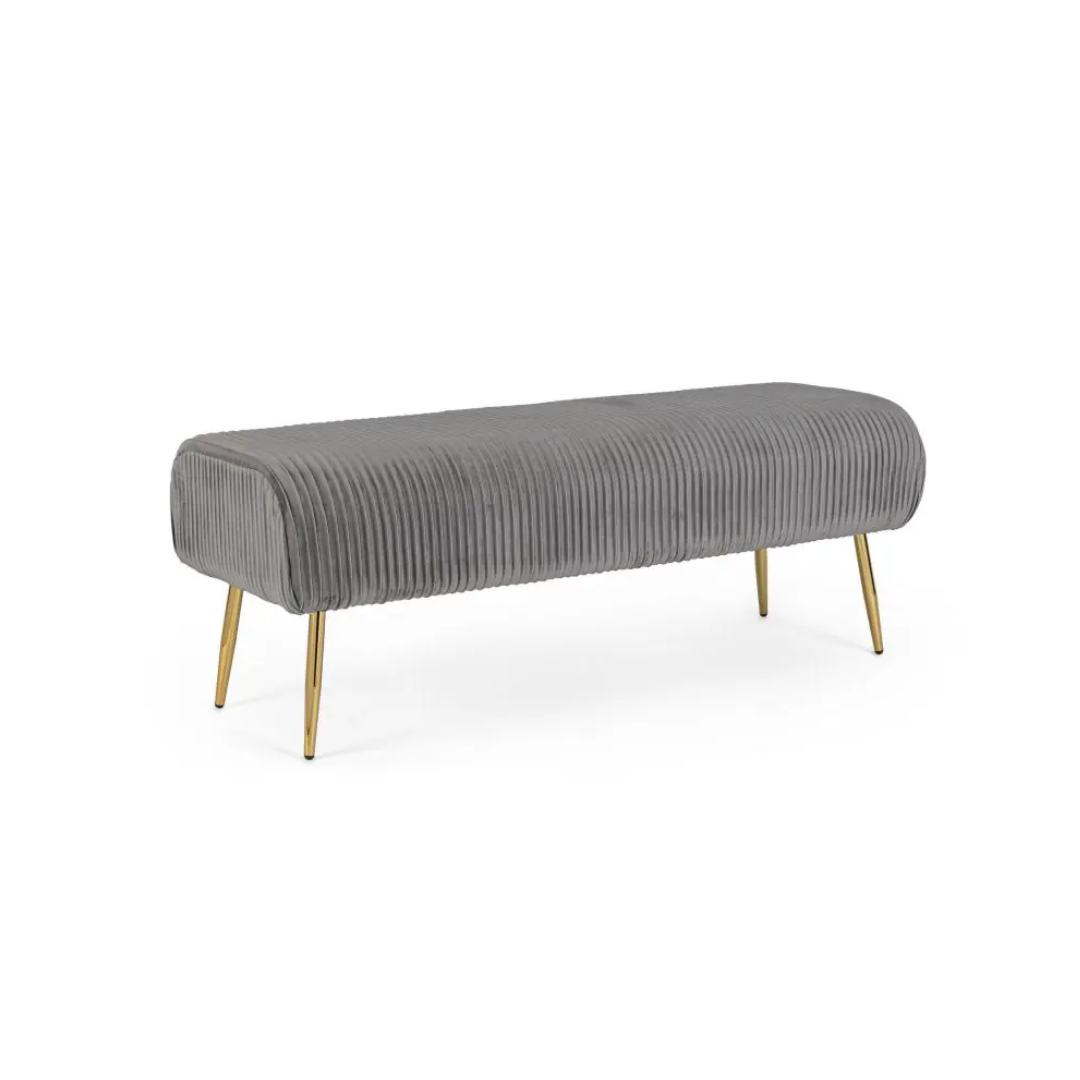 Ławka SELENA to luksusowe siedzisko, które łączy solidną konstrukcję z blaskiem chromowanego złota i modną tkaniną sztruksową (ryflowaną) w stylu Glamour.