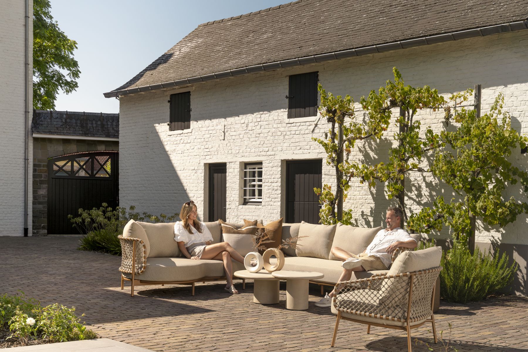 Martinique Amber to luksusowy narożnik modułowy, który wprowadza tropikalny klimat w nowoczesnym wydaniu. Zestaw wyróżnia się ramą w ciepłym kolorze Amber oraz unikalnym, ręcznie wyplatanym wzorem węzłowym (Knotted Rope). Konstrukcja obejmuje standardową sofę oraz moduł typu "Cuddle" o zwiększonej głębokości, idealny do wypoczynku w pozycji leżącej.