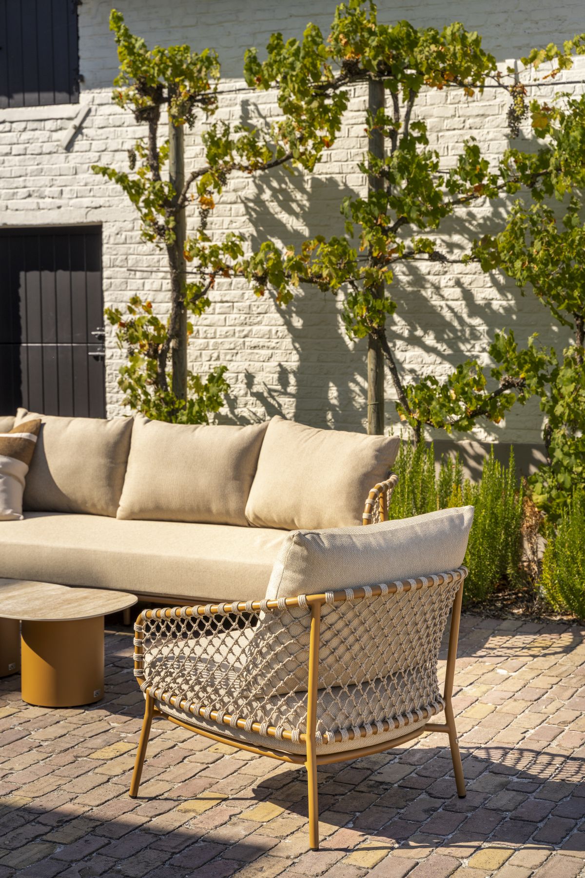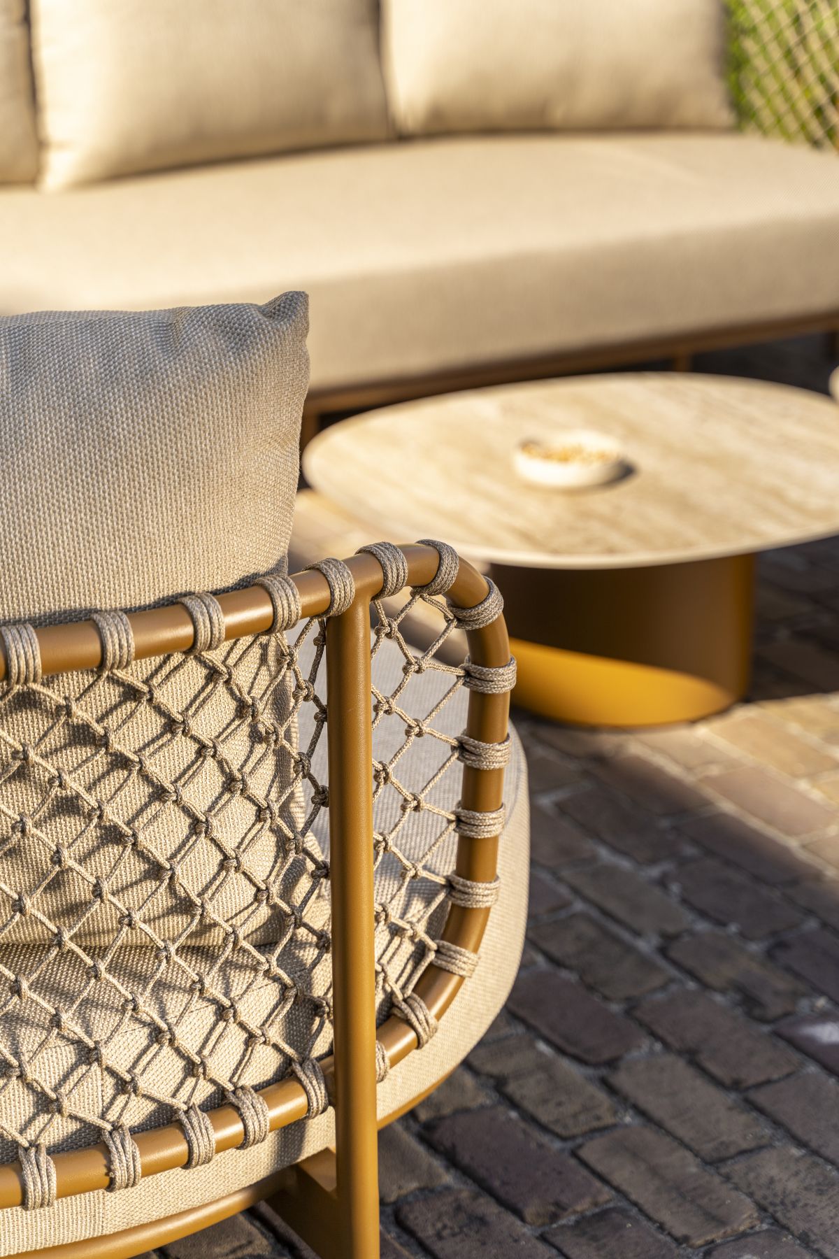 Stelaż wykonano z aluminium malowanego proszkowo w kolorze Amber. Elementem charakterystycznym jest splot liny w kolorze Sand (piaskowym), formowany w artystyczne węzły, co nadaje meblom otwartą, przewiewną strukturę.
