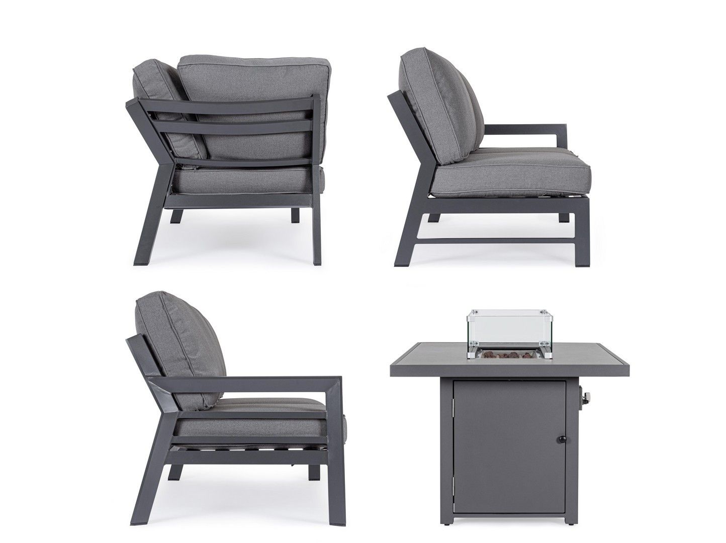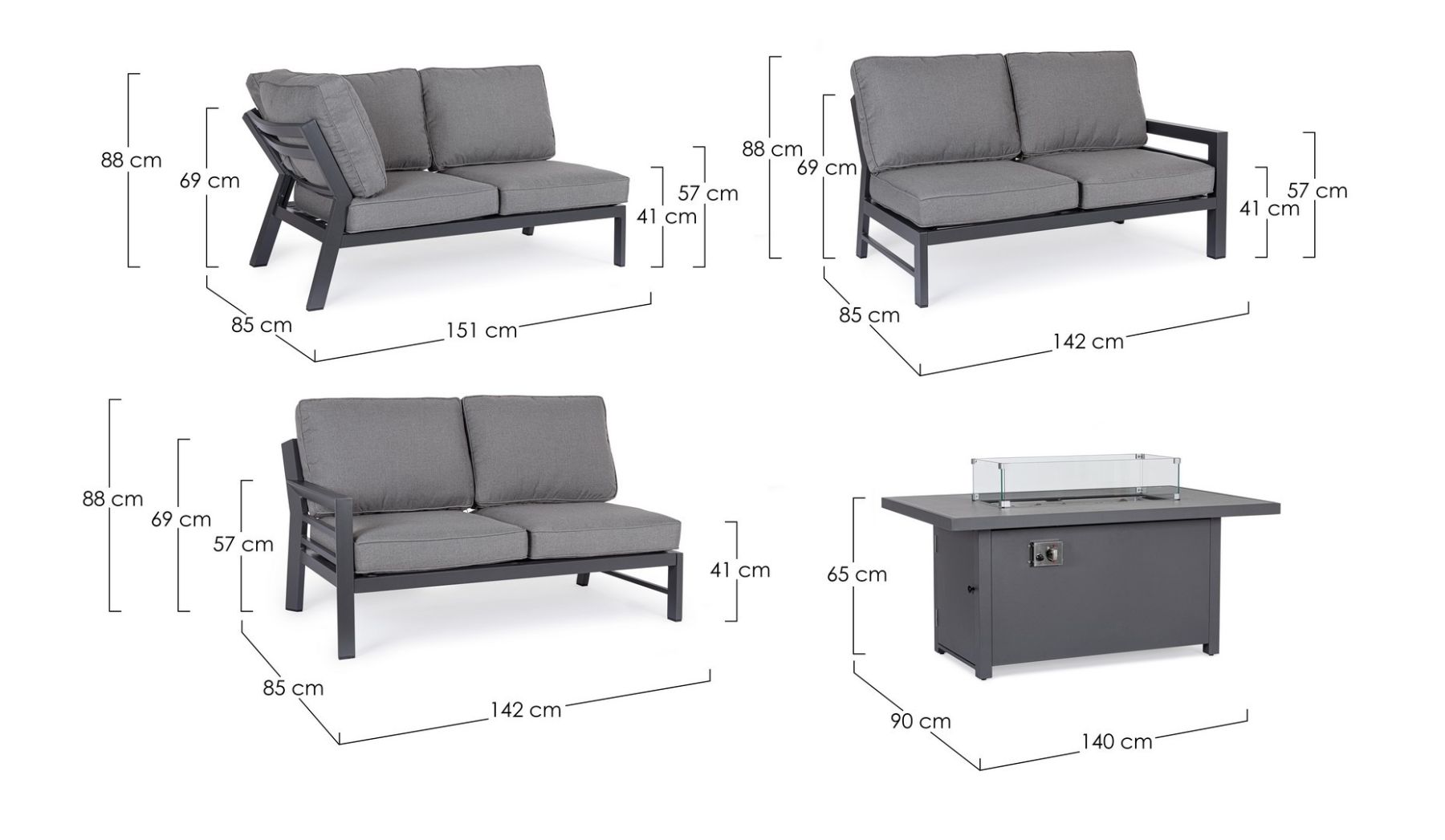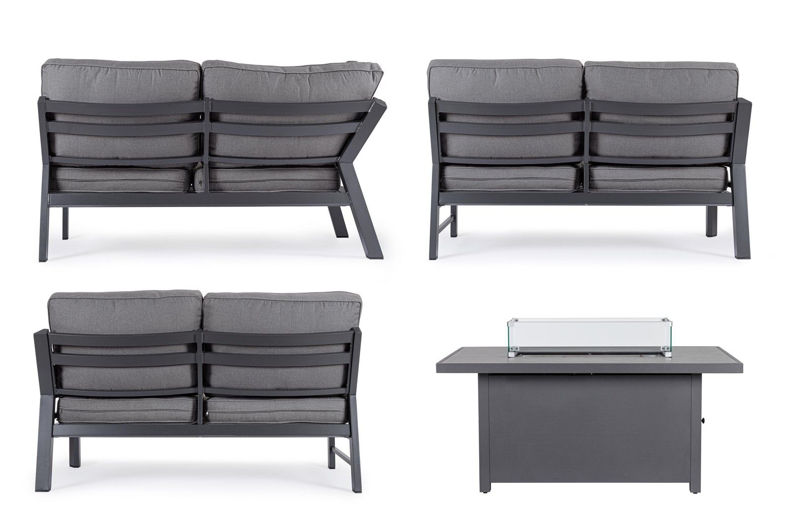Zestaw składa się z trzech modułów wypoczynkowych tworzących narożnik. Rama jest wykonana z lekkiego aluminium malowanego proszkowo w kolorze CHARCOAL (Antracyt).