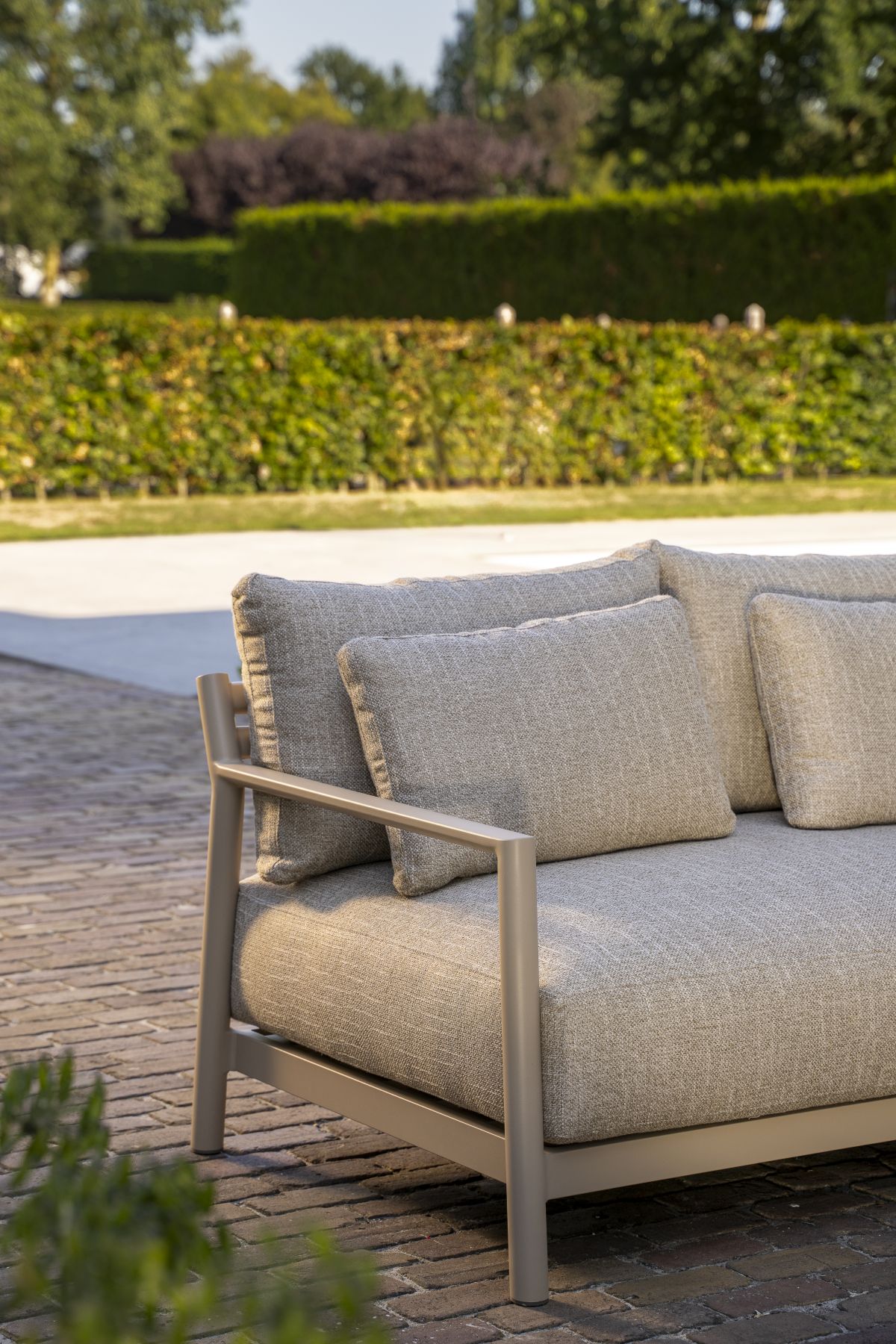 Stelaż wykonano z aluminium malowanego proszkowo w kolorze Latte. Charakterystyczna, listwowa budowa ramy (slatted aluminum) sprawia, że meble są lekkie wizualnie, a jednocześnie całkowicie odporne na korozję.