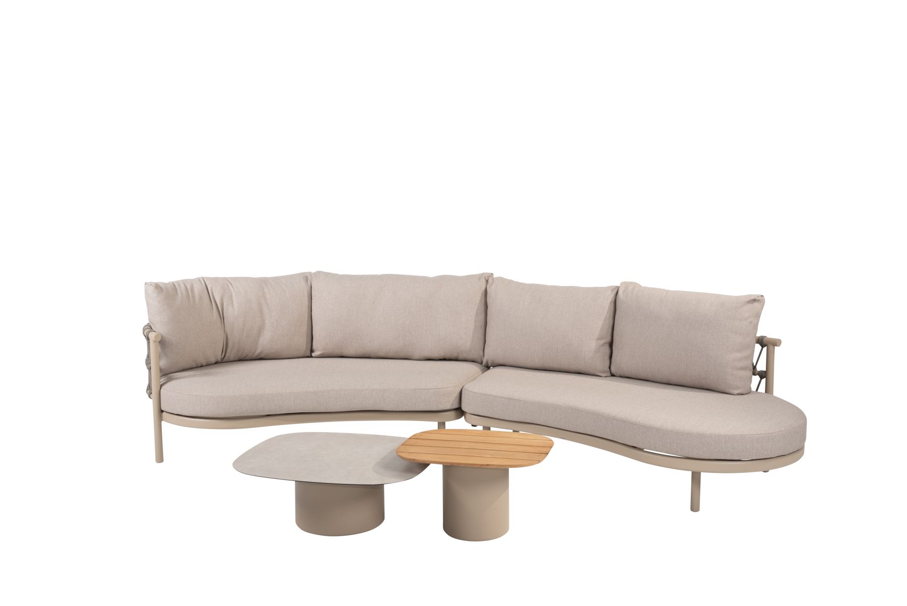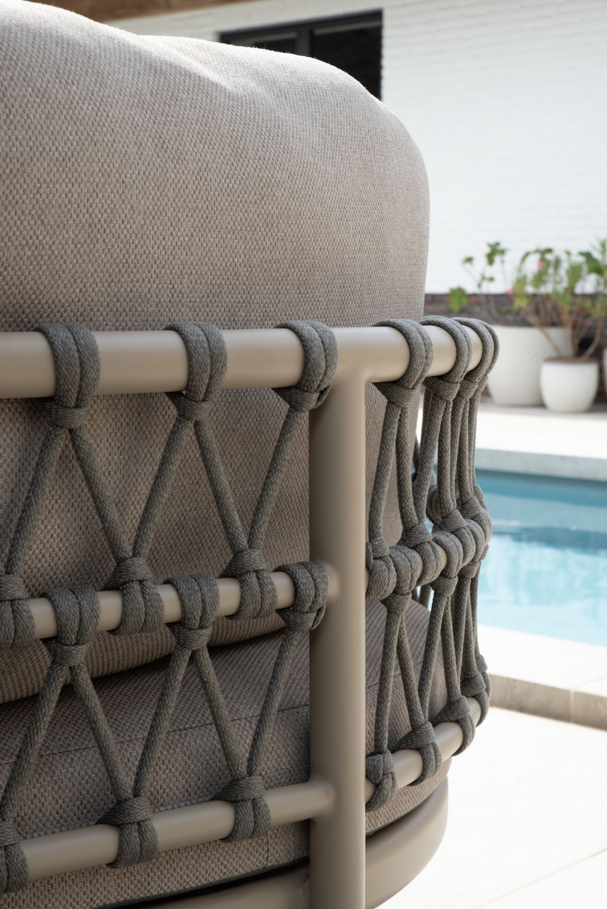 Podstawę mebli stanowi aluminium malowane proszkowo, odporne na korozję. Konstrukcję uzupełnia stylowe wykończenie linowe (Rope), które nadaje meblom lekkości i nowoczesnego charakteru.
