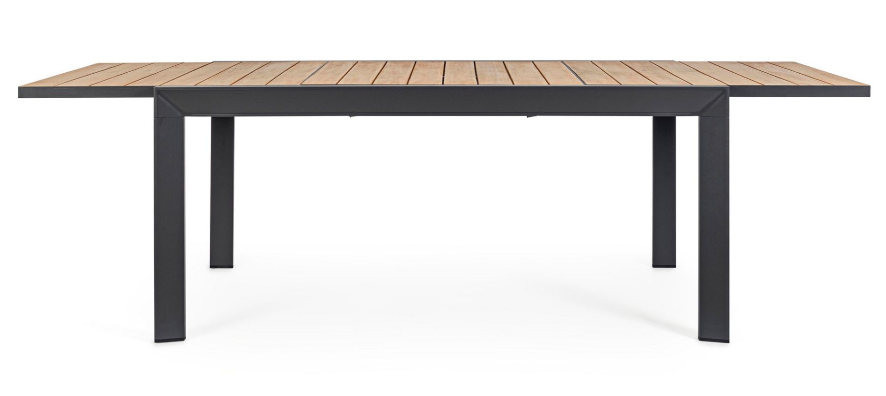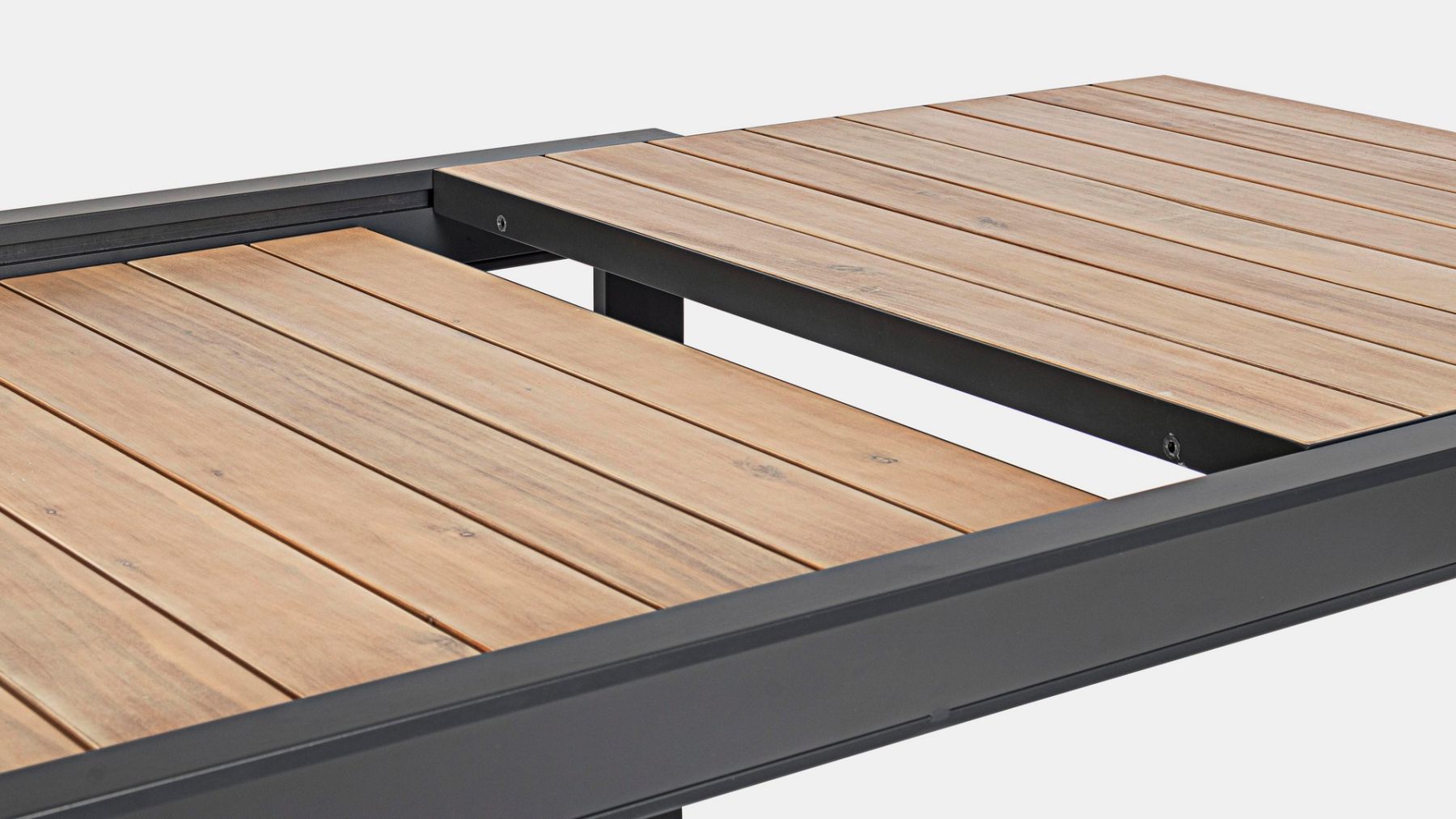 Blat wykonany z aluminiowych listew z malowaniem w efekcie naturalnego drewna doskonale imituje strukturę i kolor prawdziwego surowca, a przy tym nie wymaga żadnej konserwacji. Dzięki funkcji rozkładania stół można powiększyć z 160 cm do 240 cm, co pozwala na wygodne spotkania w większym gronie.