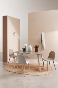 Konstrukcja stołu oparta jest na nogach ze stali malowanej proszkowo, które gwarantują stabilność i odporność na codzienne użytkowanie. Stół dostępny jest w dwóch wariantach kolorystycznych, dzięki czemu łatwo dopasujesz go do swojego wnętrza: