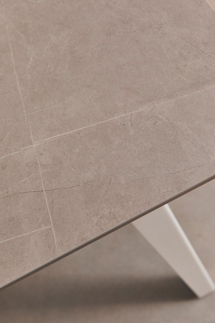 Stół Arjeta od włoskiego producenta Bizzotto to stylowy mebel łączący ponadczasowy design z funkcjonalnością i trwałością. Blat z gresu porcelanowego z efektem marmuru zachwyca subtelnym rysunkiem kamienia, wprowadzając do wnętrza elegancję i lekkość.