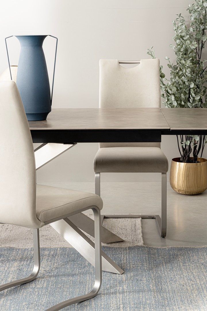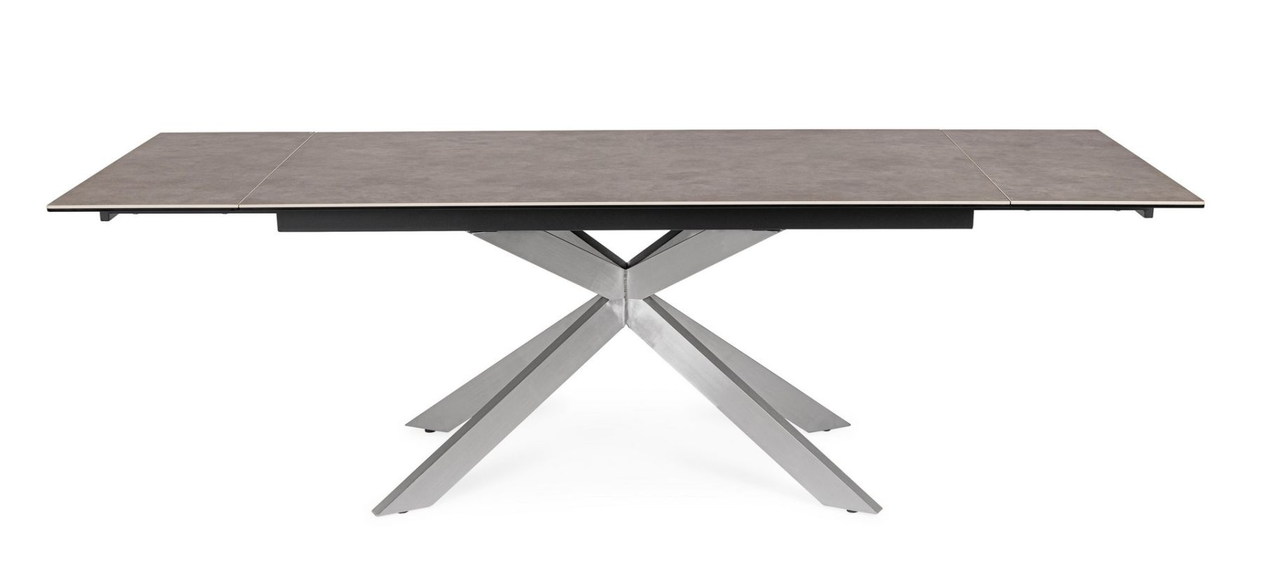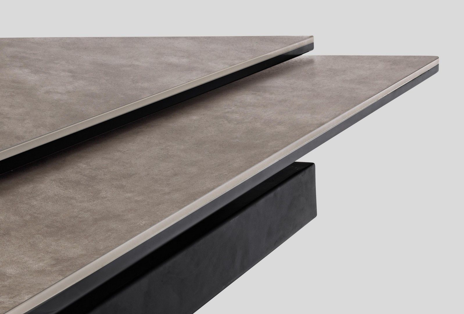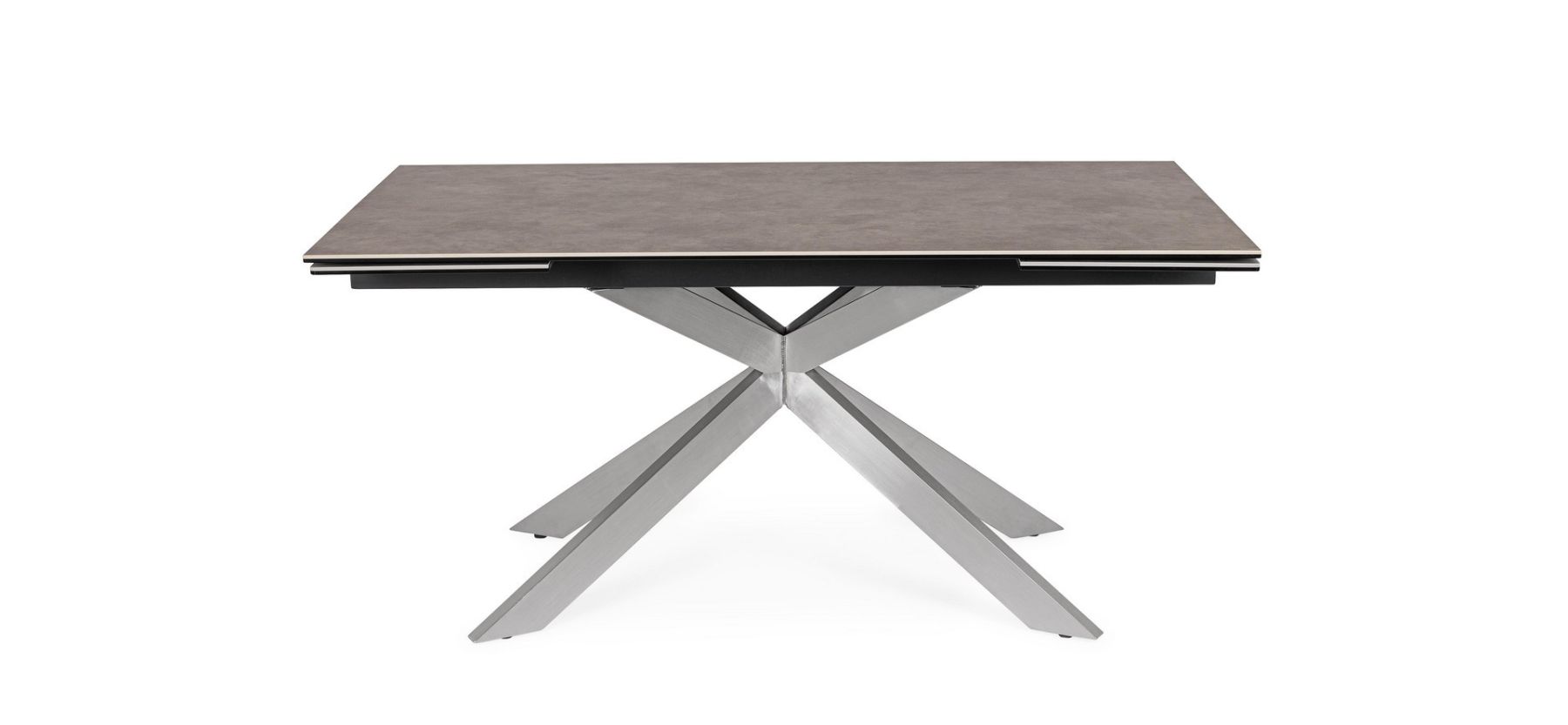 Stół Arzachel od włoskiego producenta Bizzotto to propozycja dla miłośników nowoczesnego designu i praktycznych rozwiązań. Blat z ceramiki (5 mm) wzmocniony szkłem hartowanym (8 mm) zachwyca eleganckim wykończeniem z efektem kamienia w odcieniach brązu i grafitu, tworząc luksusowy, ale stonowany akcent w przestrzeni jadalni.
