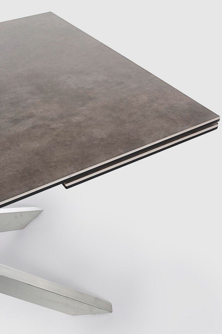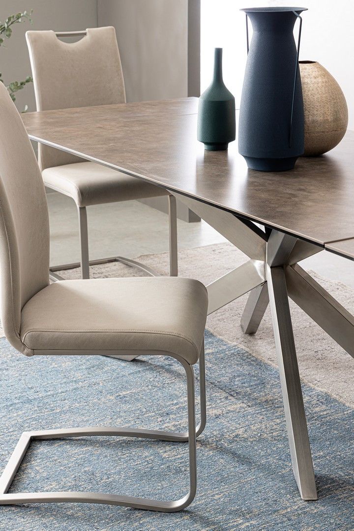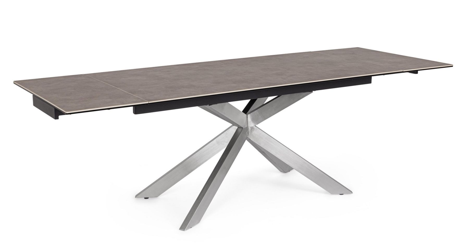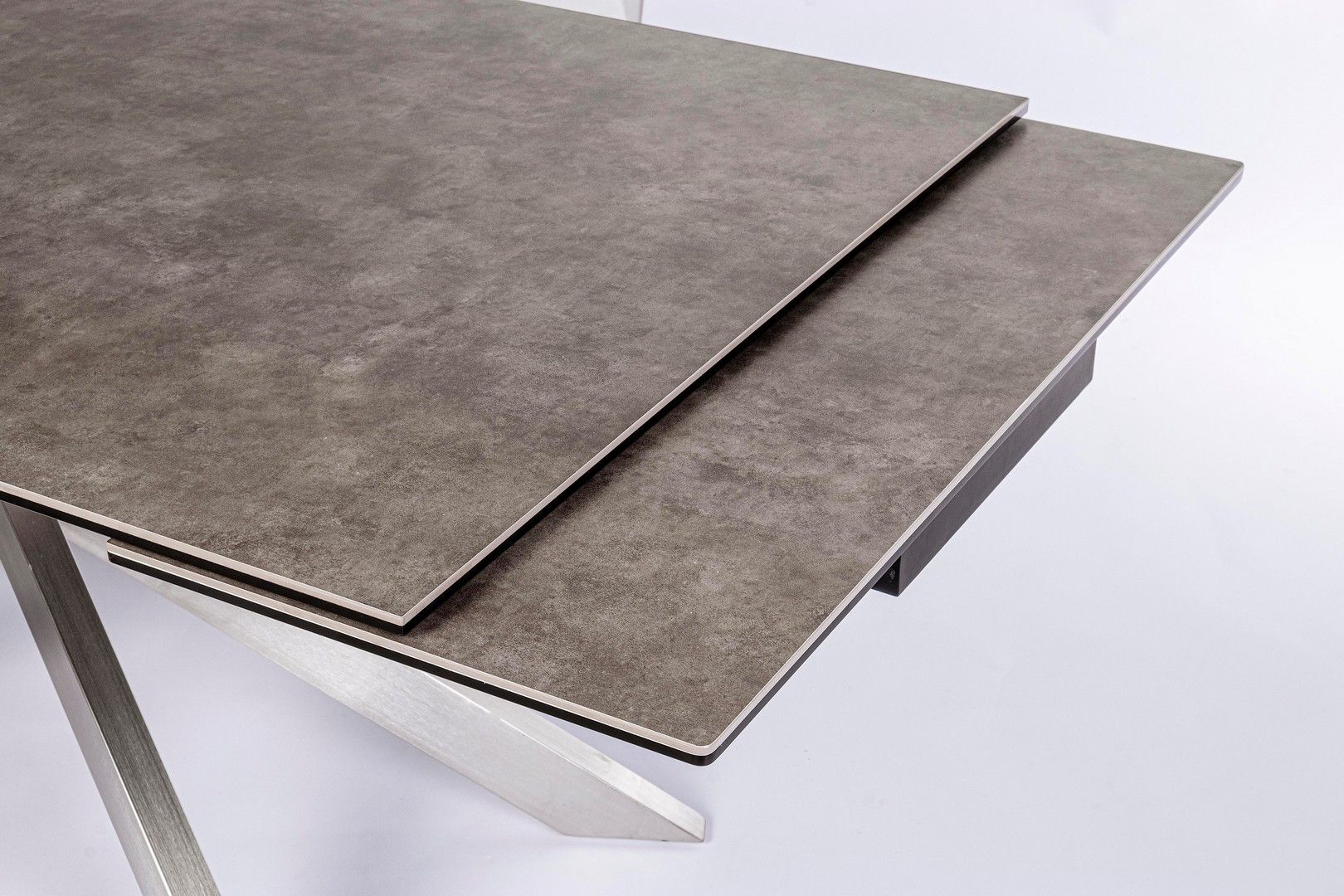 Stół Arzachel od włoskiego producenta Bizzotto to propozycja dla miłośników nowoczesnego designu i praktycznych rozwiązań. Blat z ceramiki (5 mm) wzmocniony szkłem hartowanym (8 mm) zachwyca eleganckim wykończeniem z efektem kamienia w odcieniach brązu i grafitu, tworząc luksusowy, ale stonowany akcent w przestrzeni jadalni.