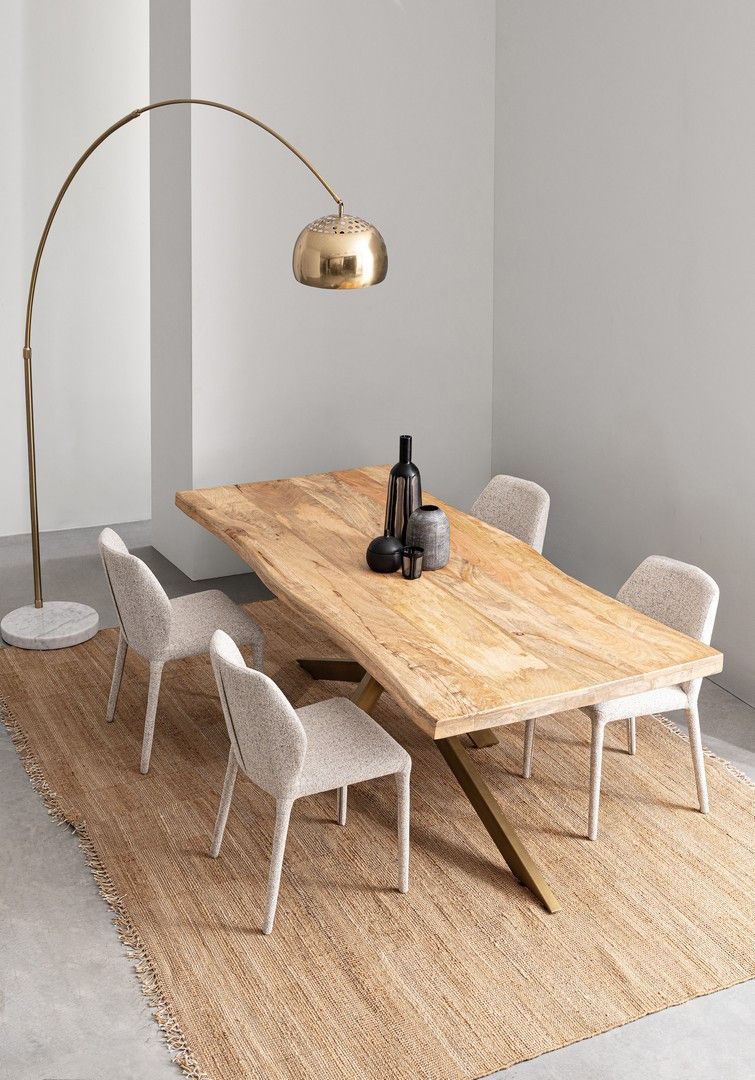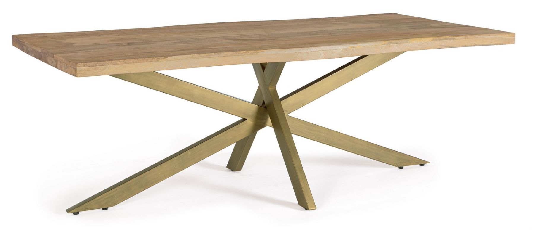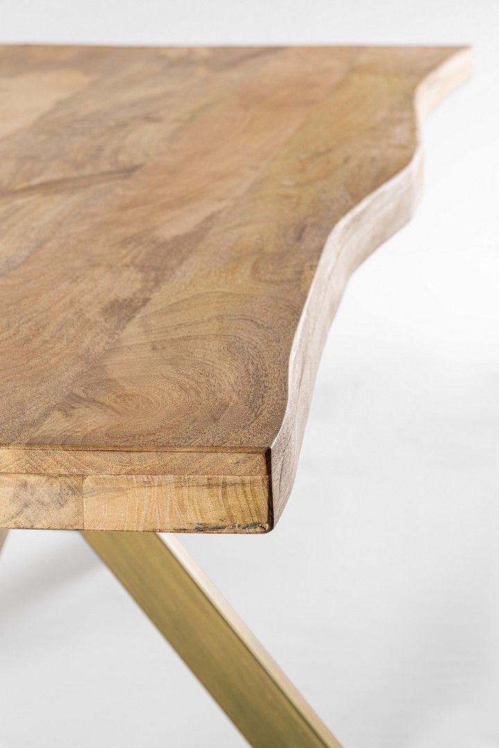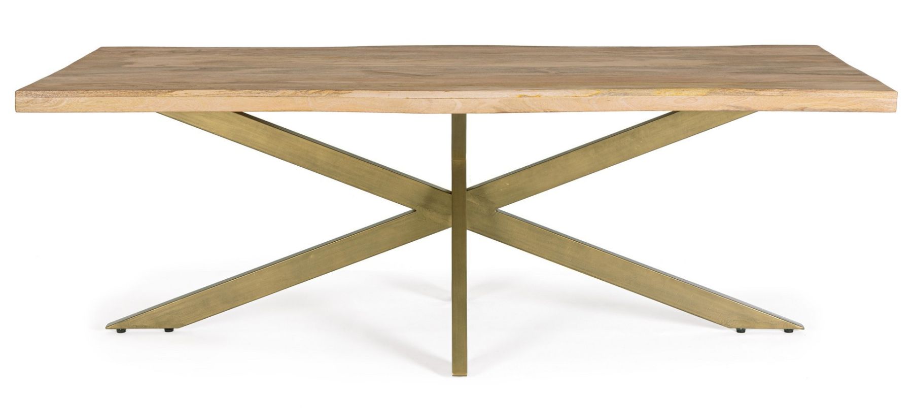 Każdy egzemplarz stołu jest unikalny -drewno obrabiane ręcznie sprawia, że kształty i linie blatu mogą się różnić, nadając każdemu stołowi indywidualny charakter. Całość wspiera stabilna stalowa podstawa w kolorze złotym, o formie przypominającej krzyżak, która dodaje meblowi elegancji i nowoczesnego wyrazu.