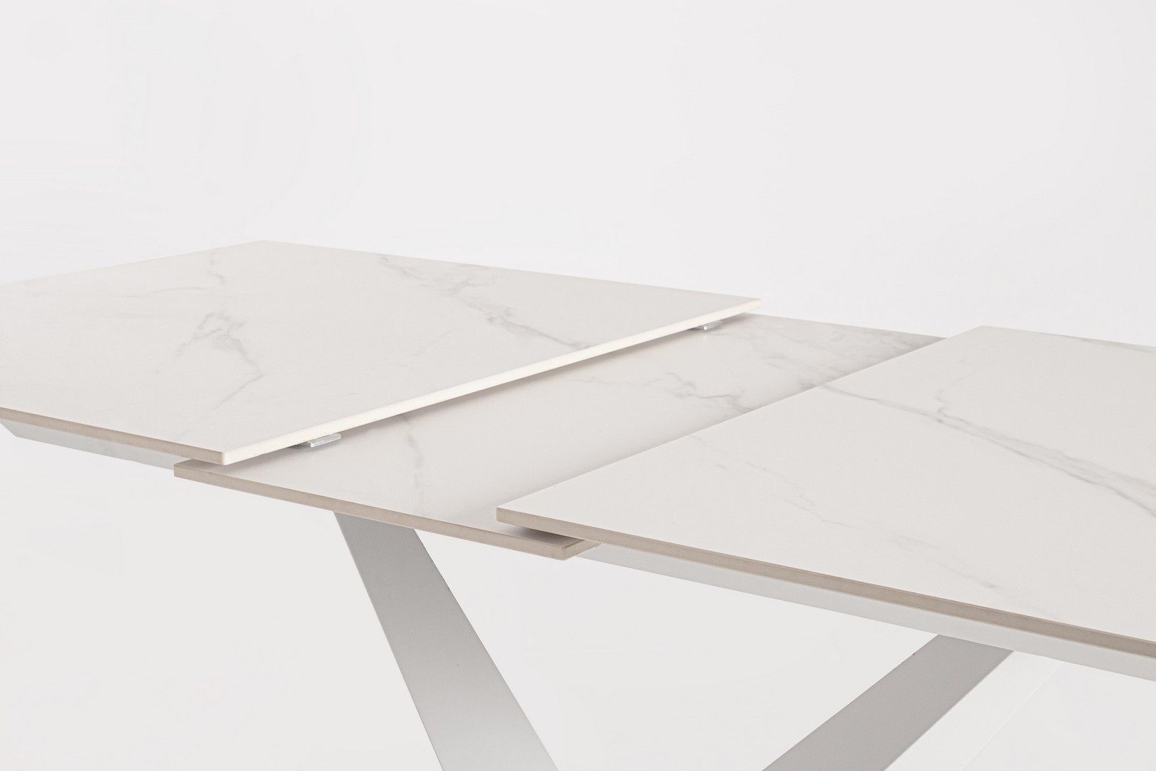White -stalowa podstawa w kolorze białym i blat z porcelanowego gresu w efekcie białego marmuru.