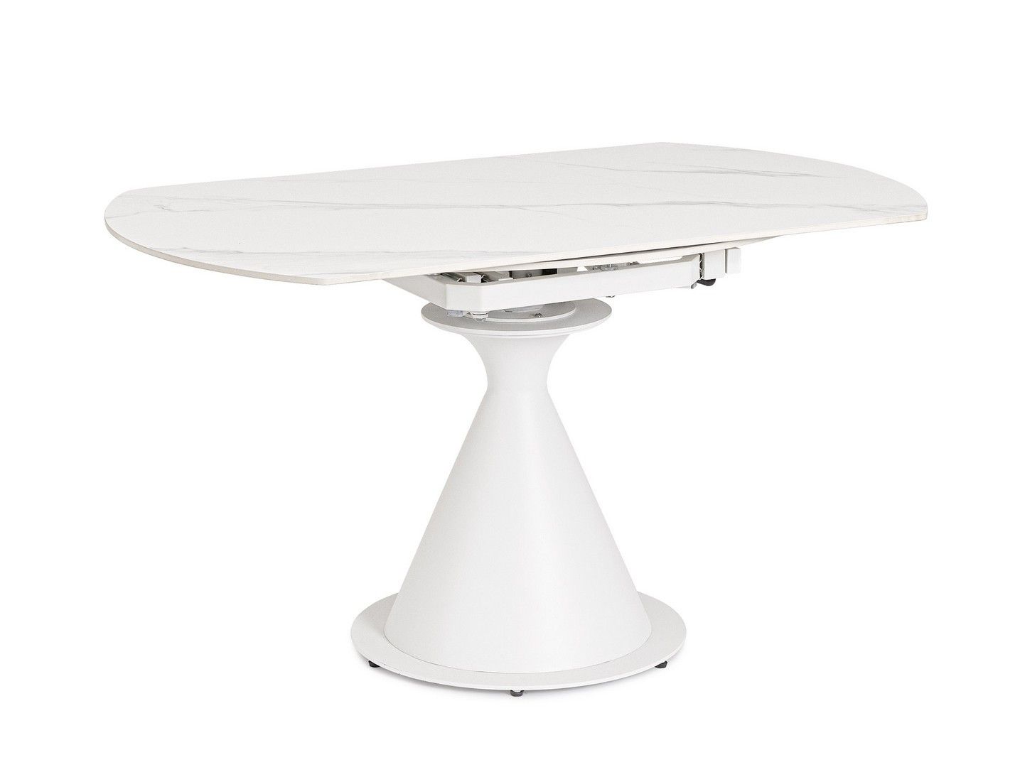 White – stalowa podstawa w kolorze białym i blat z porcelanowego gresu w efekcie białego marmuru.