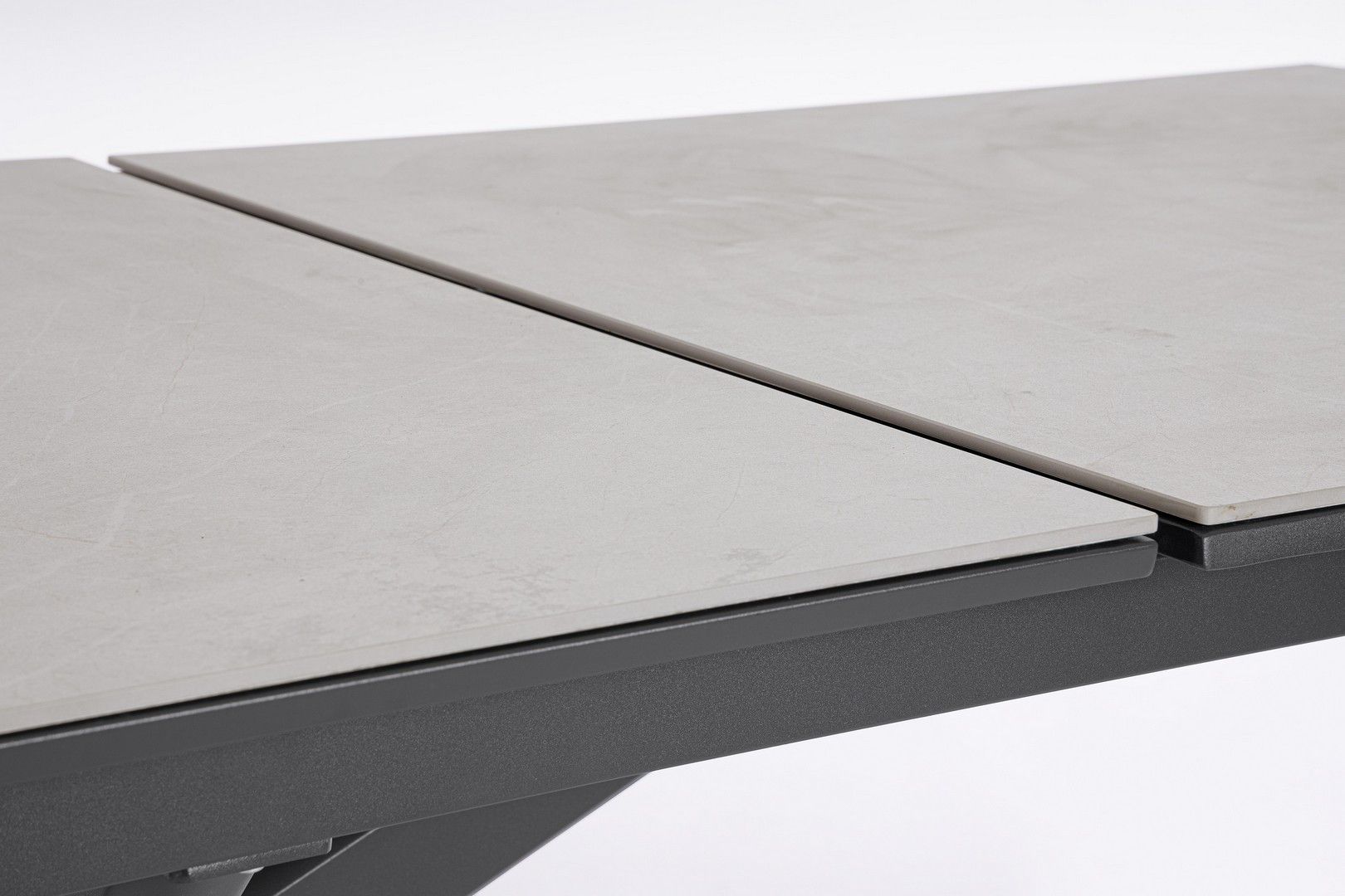 Blat z kamienia spiekanego (naturalny kamień obrabiany w wysokiej temperaturze) o grubości 11 mm wyróżnia się wyjątkową trwałością i eleganckim, szarym odcieniem o subtelnym kamiennym efekcie. Zastosowany mechanizm automatycznego rozkładania pozwala w prosty sposób wydłużyć blat z 200 do 260 cm, co zapewnia wygodę i komfort użytkowania podczas spotkań w większym gronie.