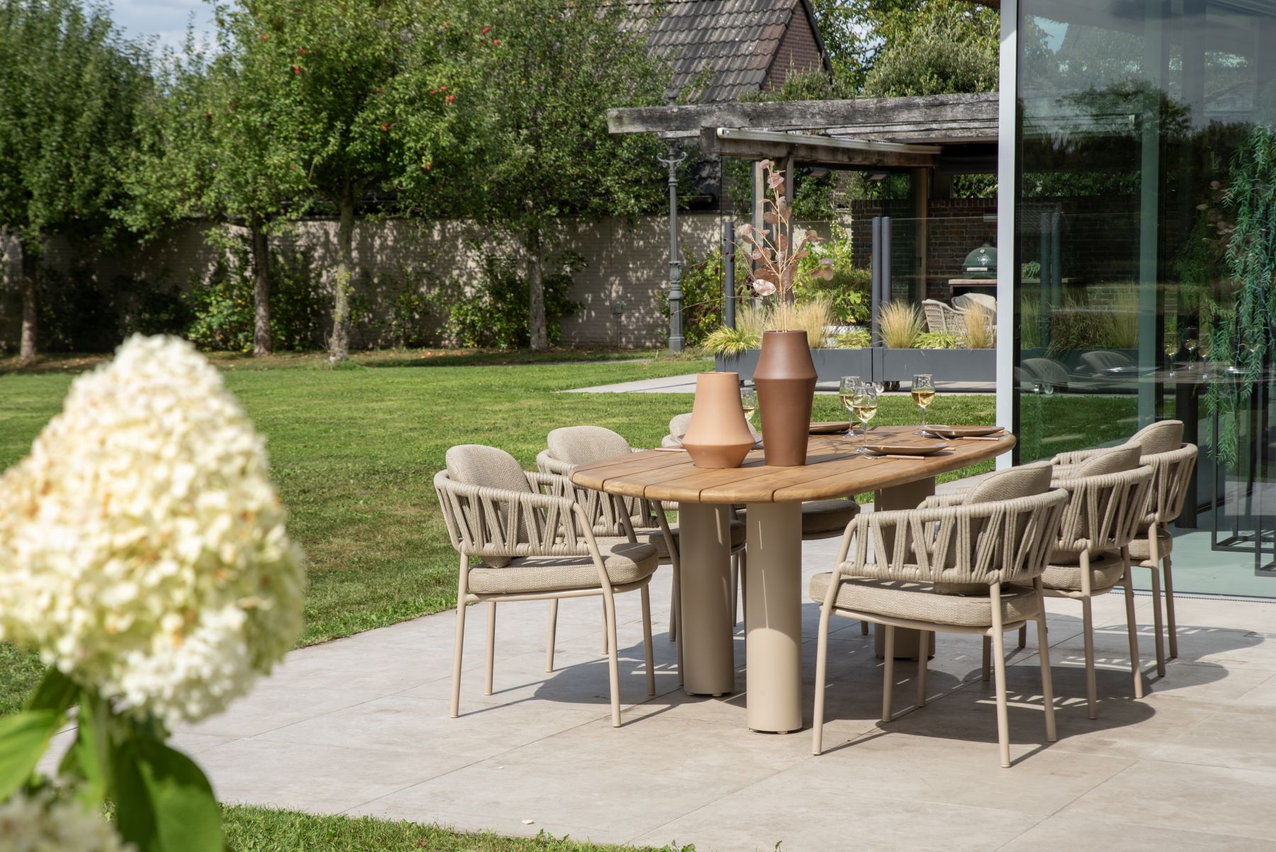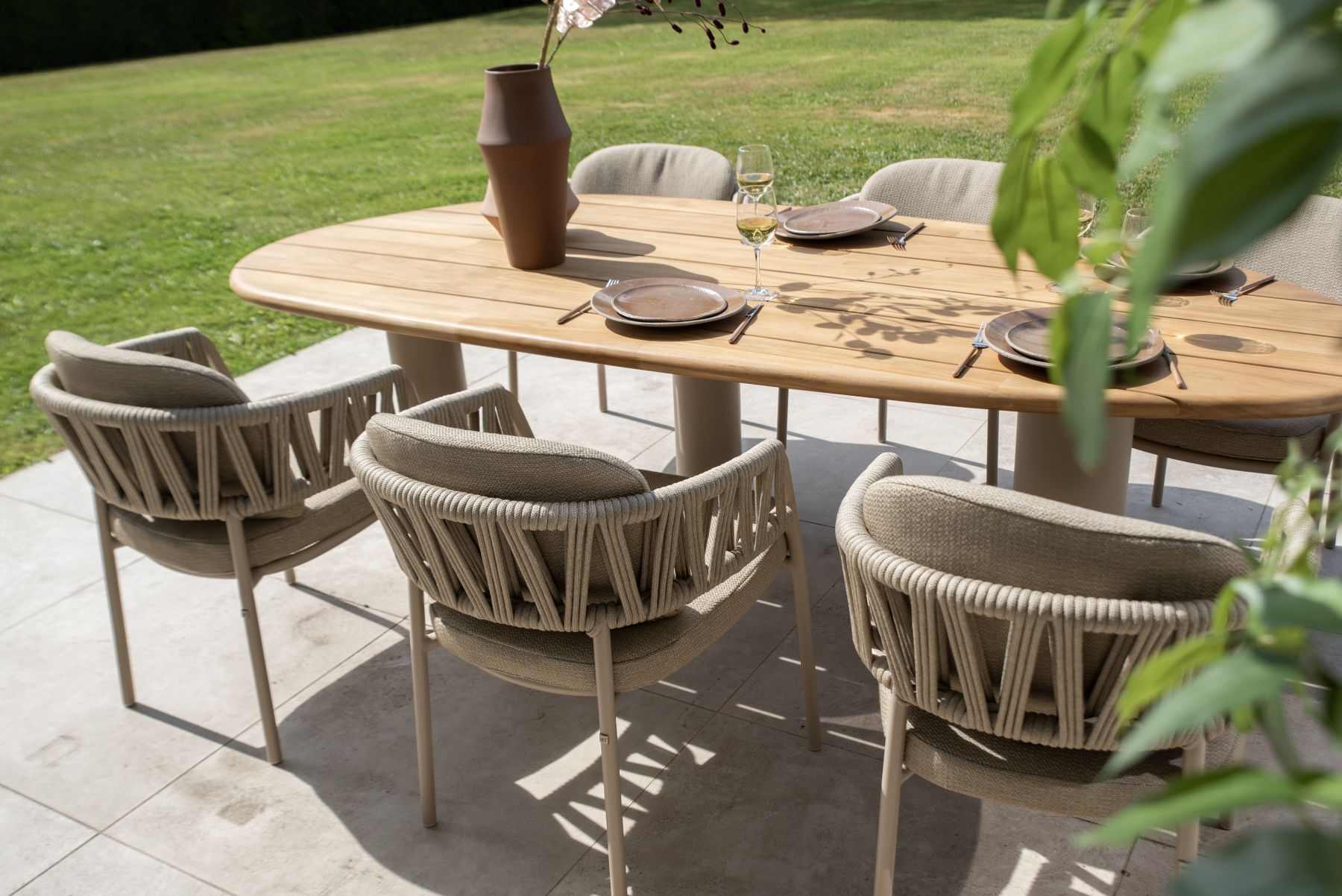 Krzesło Calma to esencja harmonii i nowoczesnego designu w jadalni ogrodowej. Model ten wyróżnia się unikalną konstrukcją ramy – oparcie płynnie przechodzi w podłokietniki, tworząc jednolitą, zaokrągloną i otulającą formę. Całość dopełnia elegancki, pionowy splot linowy oraz komfortowe poduszki.