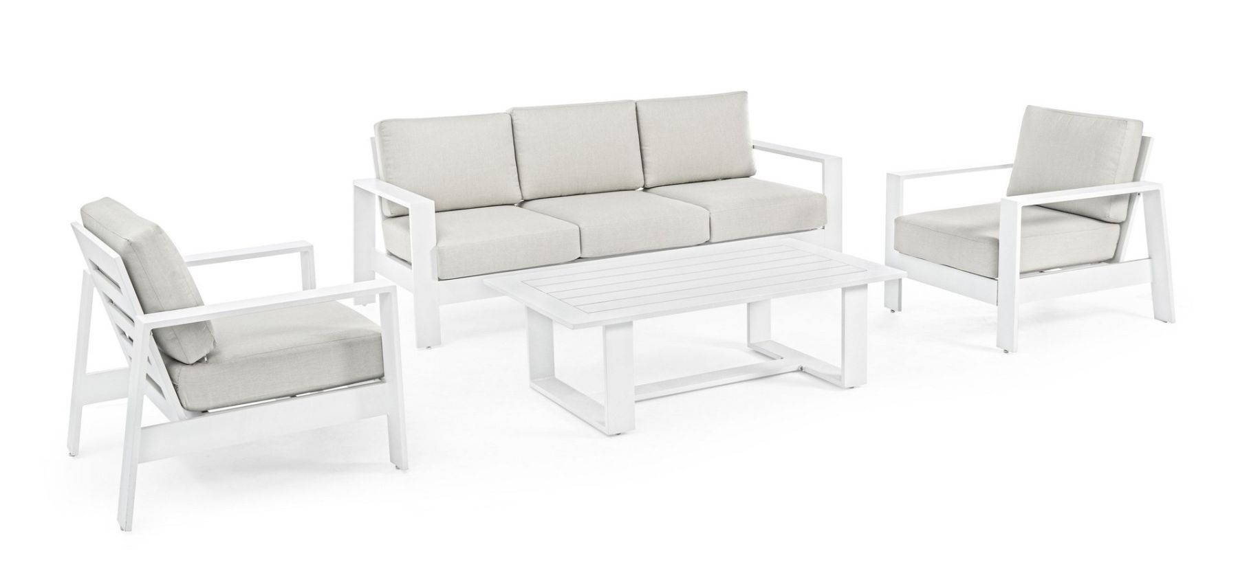 Ten zestaw 4-częściowy (sofa 3-osobowa, dwa fotele i stolik kawowy) jest w pełni przystosowany do warunków atmosferycznych: