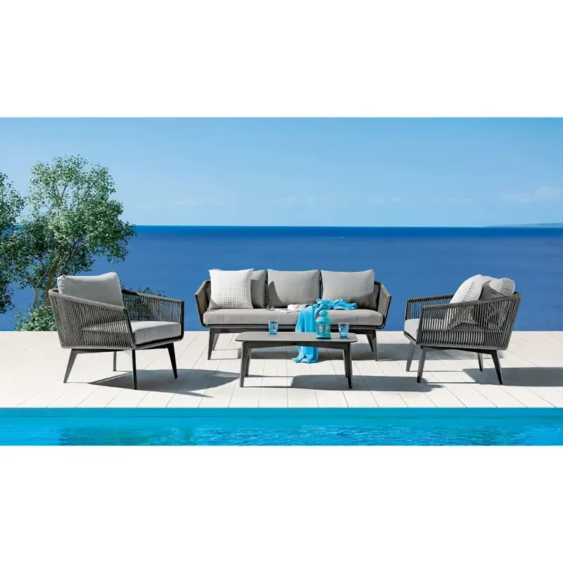 Rama: Meble (fotele, sofy, stolik) oparte są na solidnej aluminiowej konstrukcji malowanej proszkowo. Gwarantuje to odporności na korozję i stabilność.