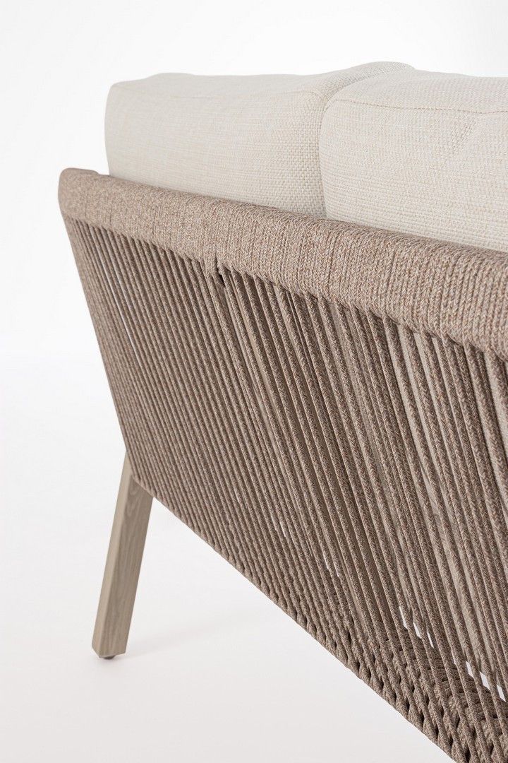 Plecionka: Oparcie i podłokietniki mają formę ręcznej plecionki z liny poliestrowej (5 mm), odpornej na promienie UV i wilgoć.