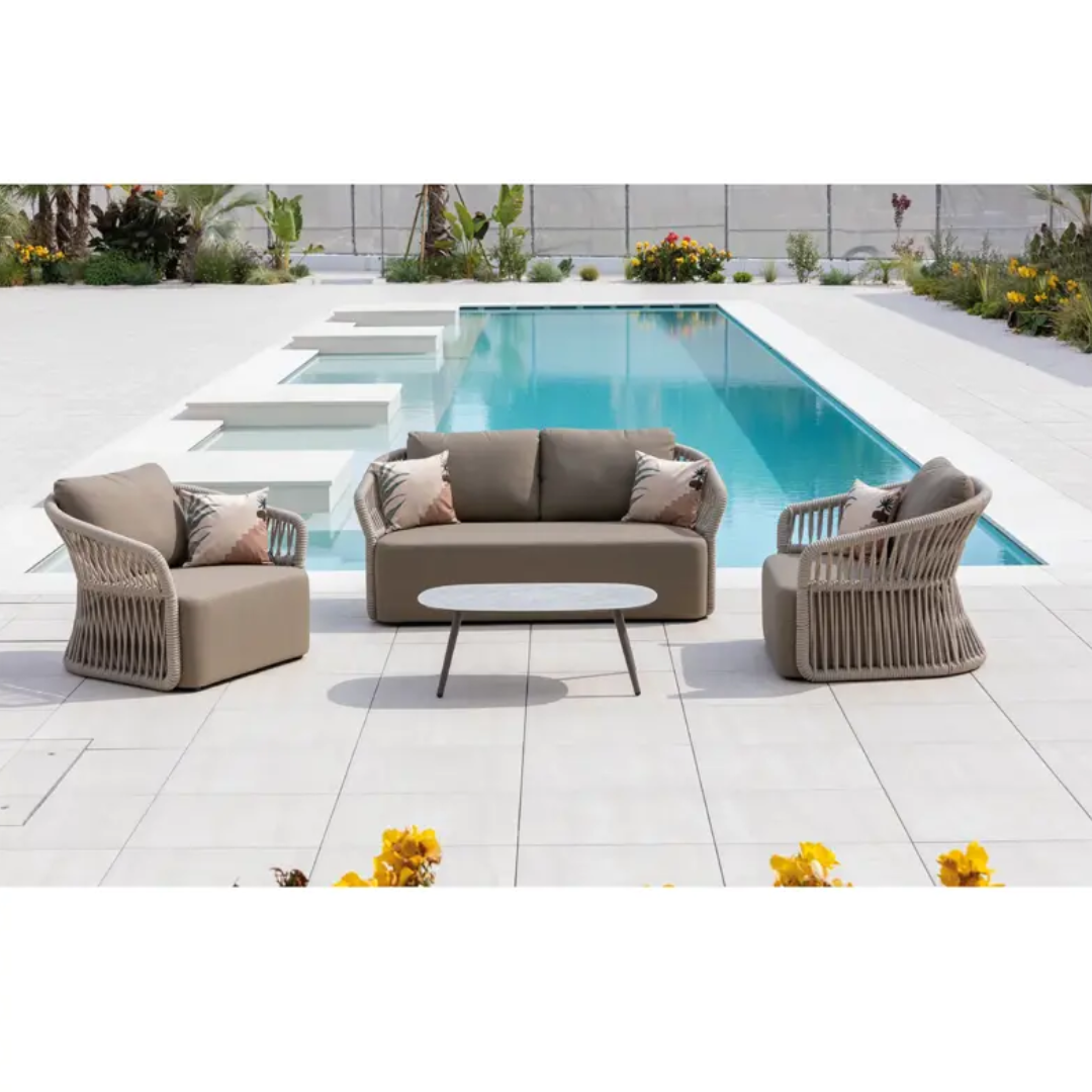 Plecionka (Ręczne Wykonanie): Oparcia foteli i sofy są ręcznie wyplatane z grubej, liny syntetycznej. Lina ta jest odporna na wilgoć i promienie UV.