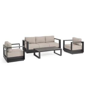 Ten zestaw 4-częściowy (sofa 3-osobowa, dwa fotele i stolik kawowy) jest w pełni przystosowany do warunków atmosferycznych: